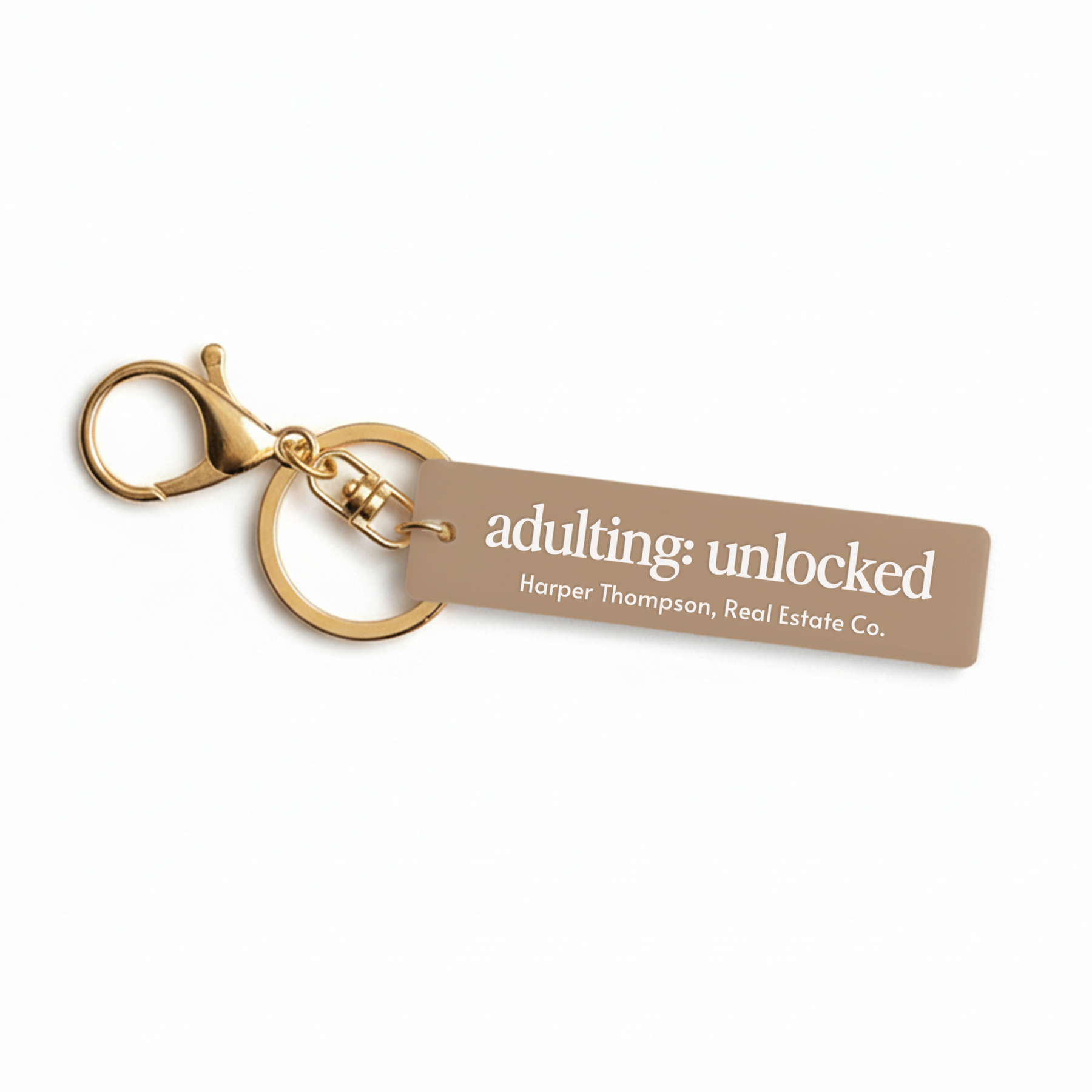Sleek, simple, and branded — this slim bar keychain features an elegant "adulting: unlocked" design with your name and brokerage engraved right below. Laser engraved and paint-filled on premium acrylic, it's the kind of closing gift clients will clip on and never take off.