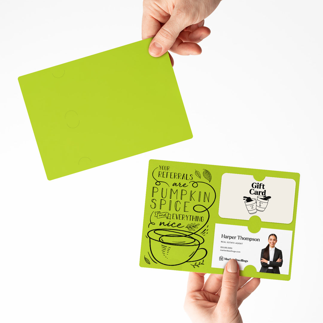 Here's a warm and fuzzy mailer for your clients this Fall. Whether you're a real estate agent, mortgage loan officer, insurance agent, or just want to let your clients know you appreciate their referrals. This card is excellent for that. Slide in a gift card on the top slots to your favorite coffee shop, then slide in your business card in the bottom slots.