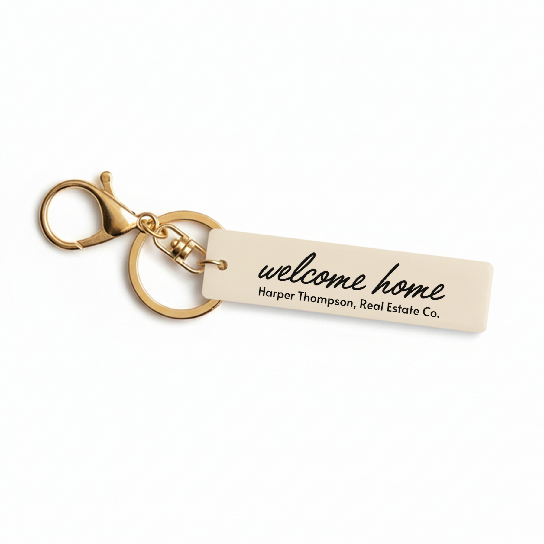 Sleek, simple, and branded — this slim bar keychain features an elegant "welcome home" design with your name and brokerage engraved right below. Laser engraved and paint-filled on premium acrylic, it's the kind of closing gift clients will clip on and never take off.