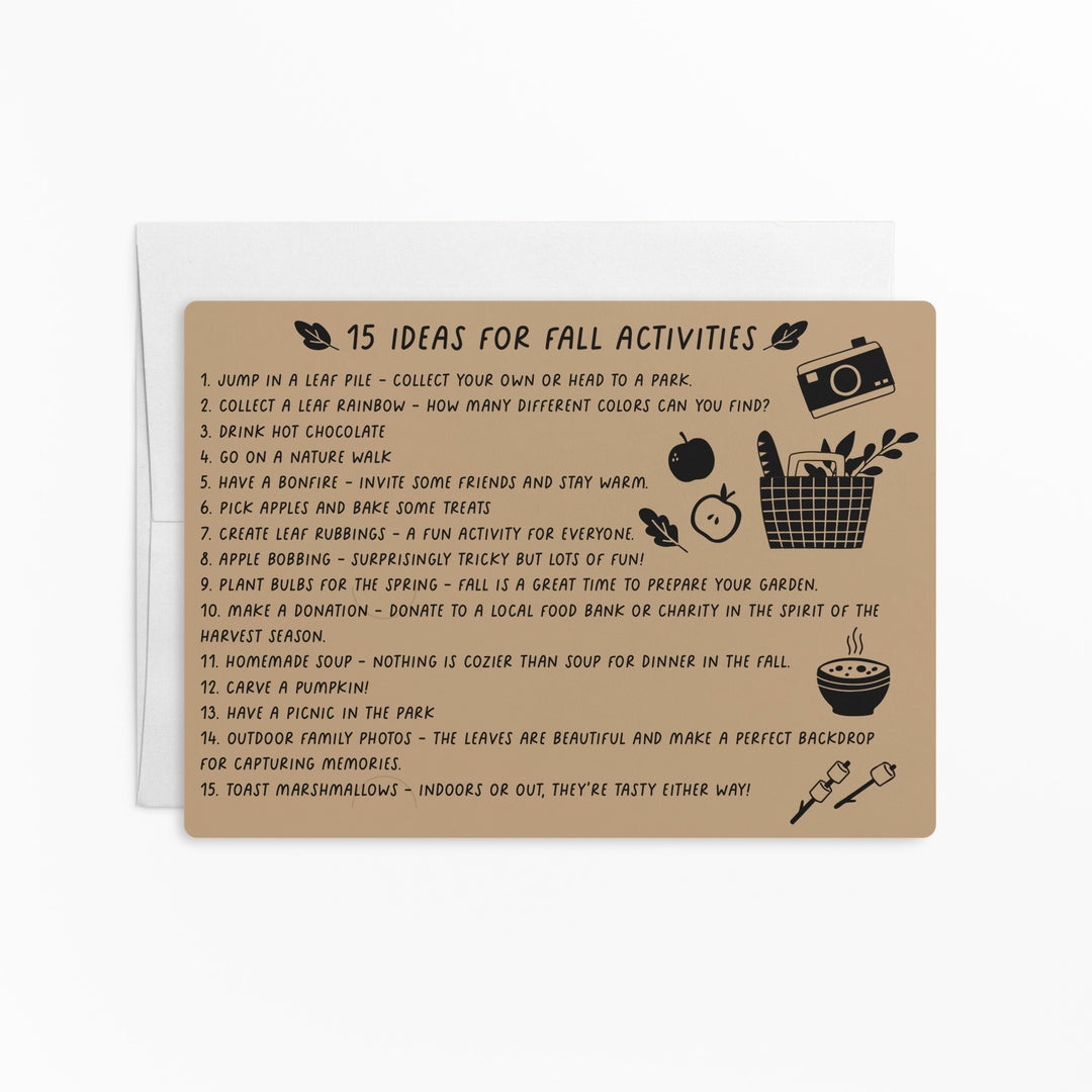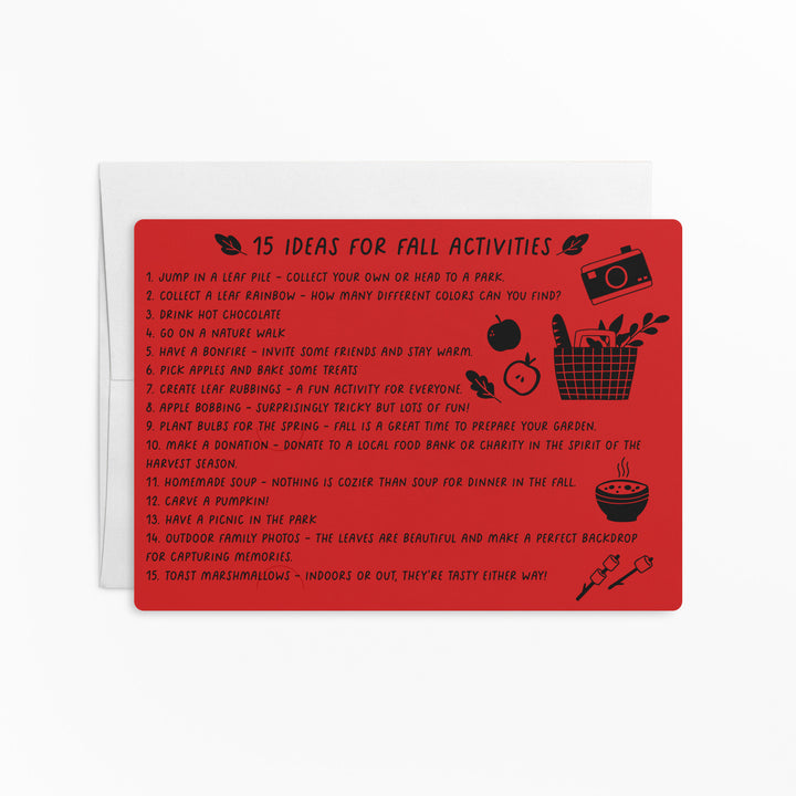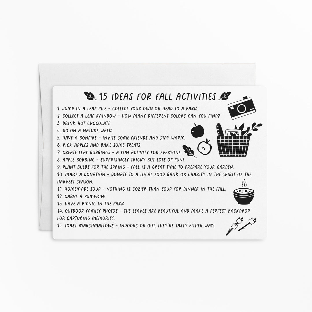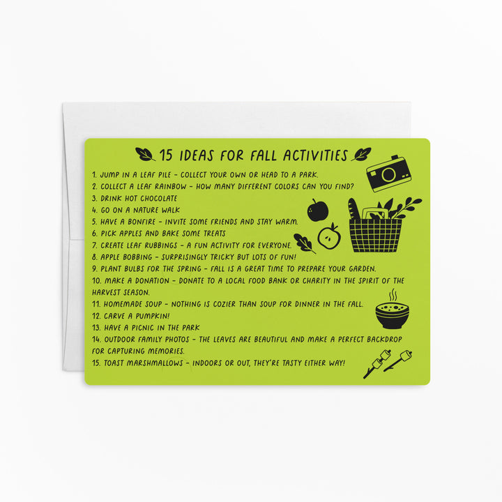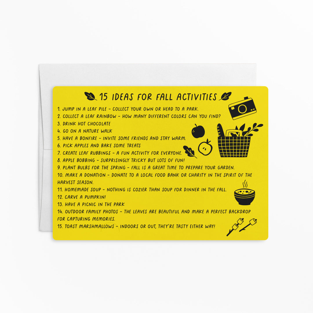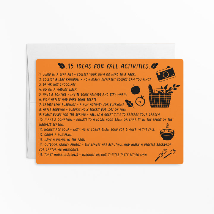 Kick off your Fall marketing with these 15 Ideas For Fall Activities mailers! This item comes with white envelopes. There are slots on the card for you to slide your business card in. These will stand out from other mailers and create a memorable experience when opened.