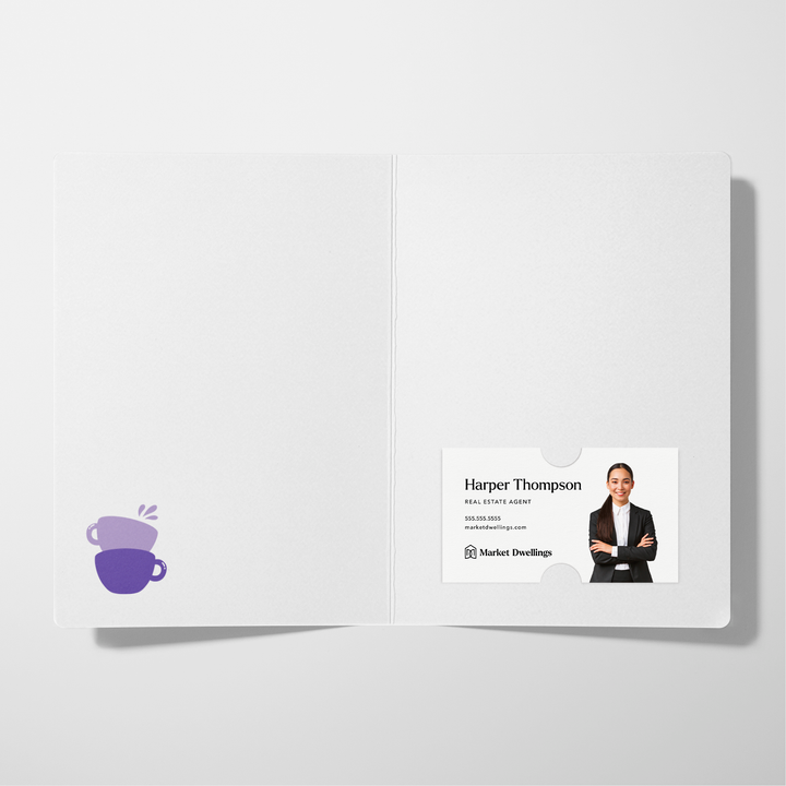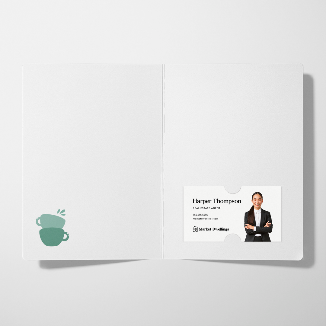 coffee-themed realtor greeting card, client appreciation cards, customizable real estate marketing tools, thank-you cards for real estate agents, business card slot greeting cards, referral appreciation cards, professional branding cards with peel-and-stick envelopes