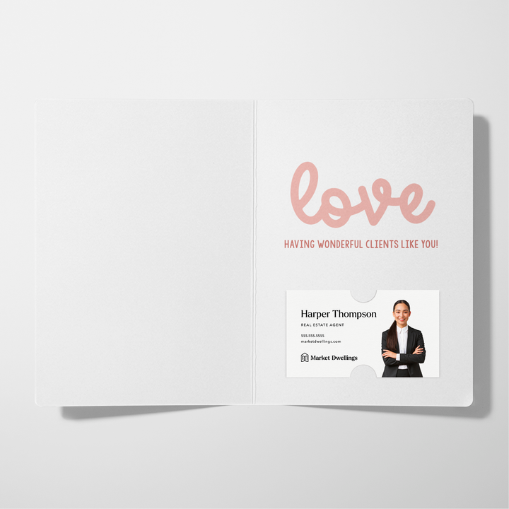 valentine's day greeting cards for realtors, client appreciation cards, customizable real estate marketing tools, festive cards with business card slot, professional Valentine’s Day cards for real estate agents, realtor Valentine client connection cards, cards with peel-and-stick envelopes