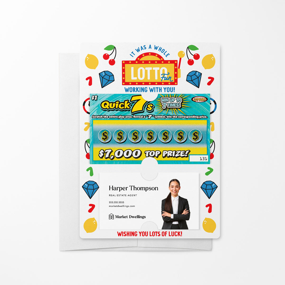These It Was A Whole Lotto Fun Working With You! Mailers are a unique and impactful way to thank clients and collaborators for their partnership. The playful design paired with an interactive scratch-off ticket slot ensures your mailers leave a lasting impression. With peel-and-stick envelopes, sending these thoughtful messages is simple and professional.
