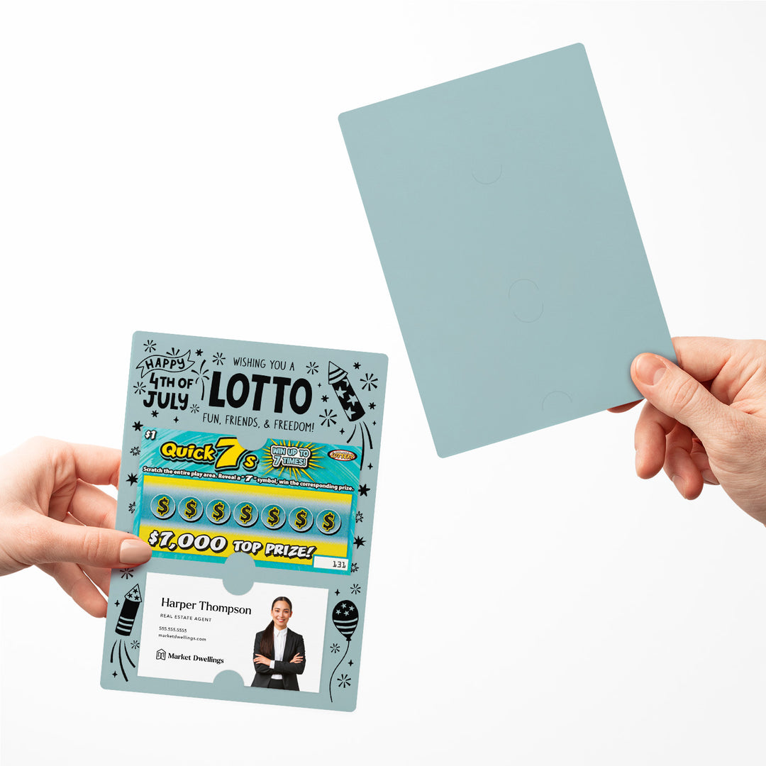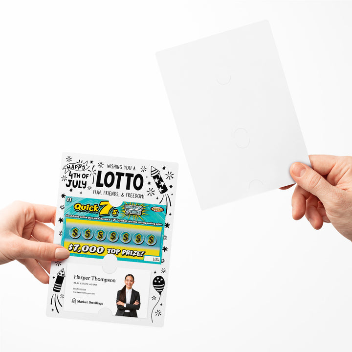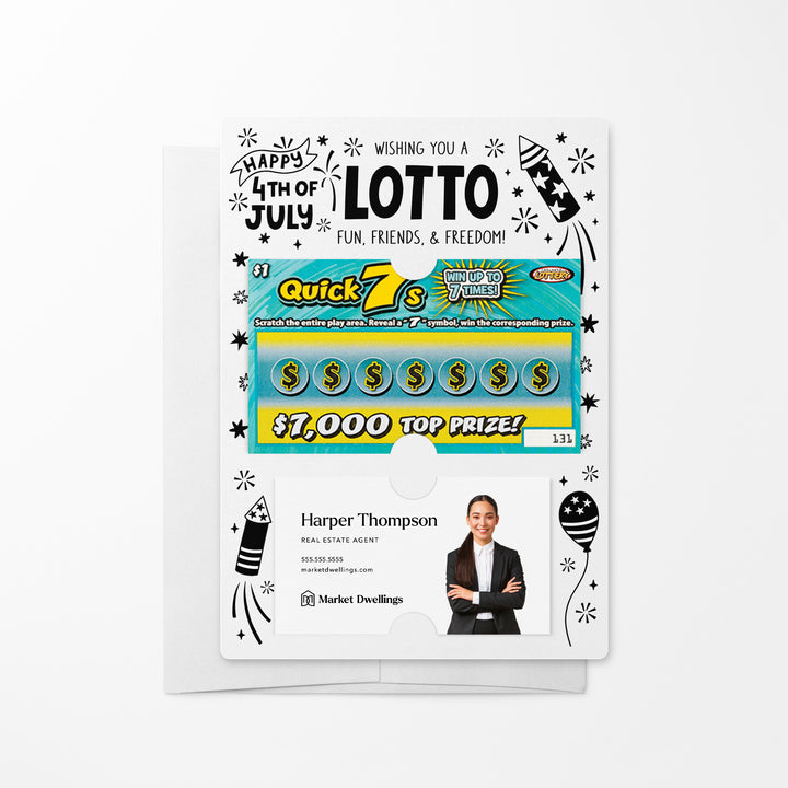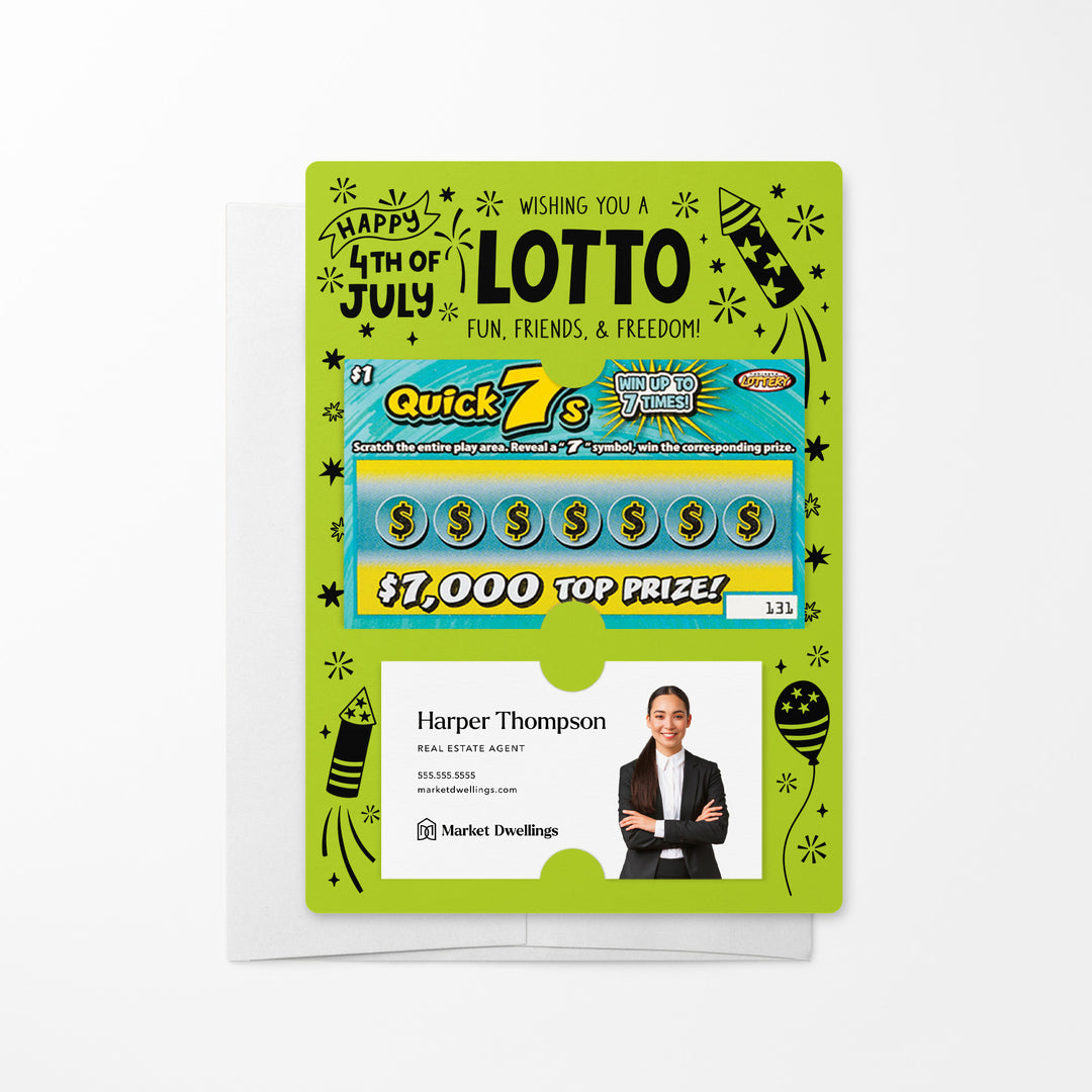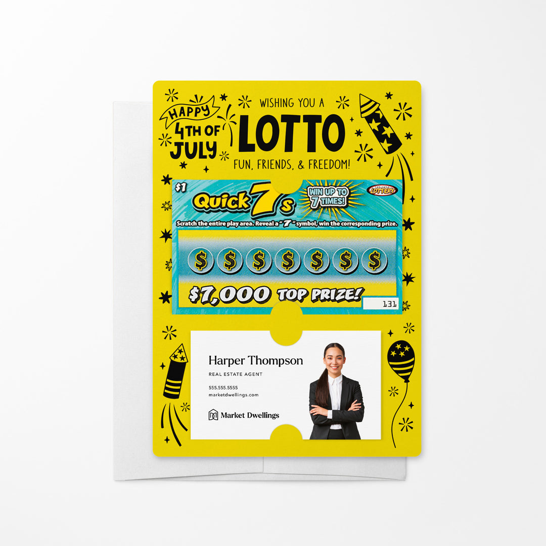Celebrate Independence Day with our Wishing You A Lotto Fun, Friends, and Freedom Happy 4th Of July Mailers w/ Envelopes! These patriotic mailers are a festive way to connect with your clients and show your appreciation. Featuring slots for a scratch-off ticket and your business card, these mailers combine the festive spirit of the 4th of July with professional branding. Each mailer includes an easy peel-and-stick white envelope for hassle-free mailing.