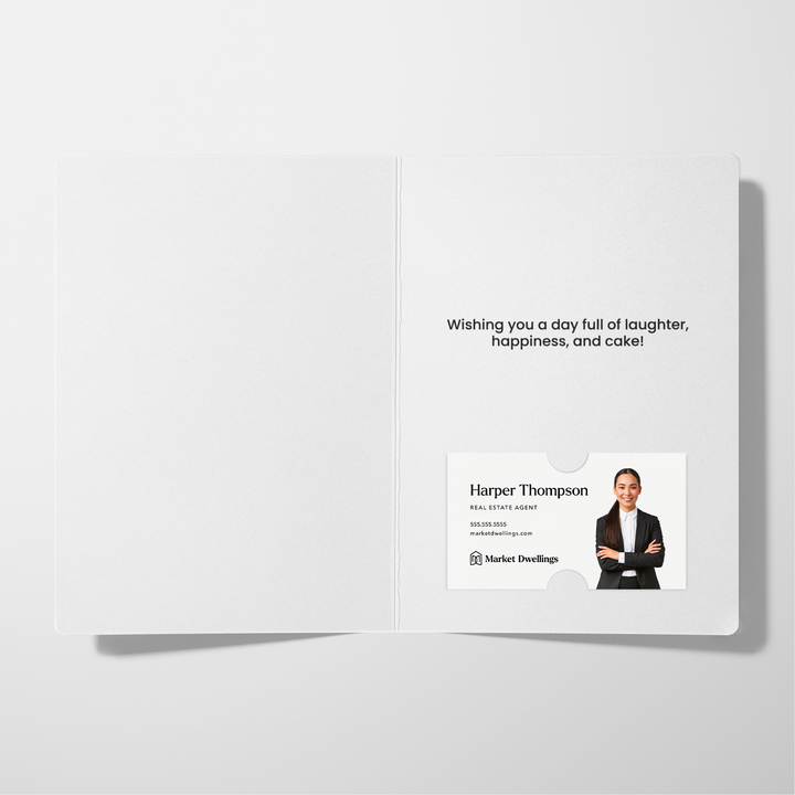 birthday greeting card for realtors, customizable realtor marketing tools, client birthday cards, festive business card greeting cards, professional birthday cards for real estate agents, real estate client outreach, birthday cards with peel-and-stick envelopes, business card slot greeting cards.
