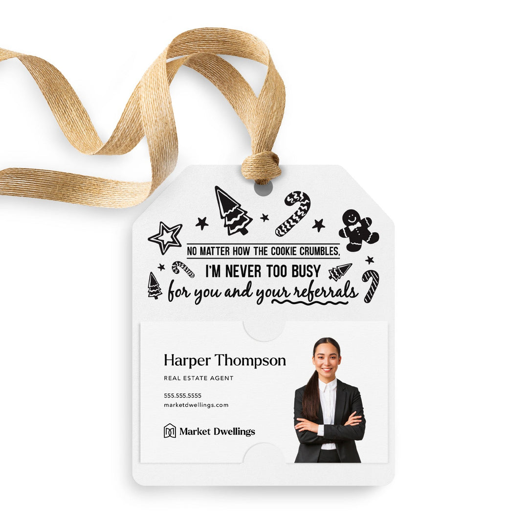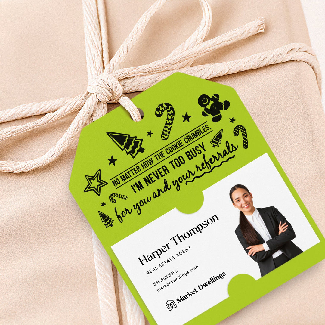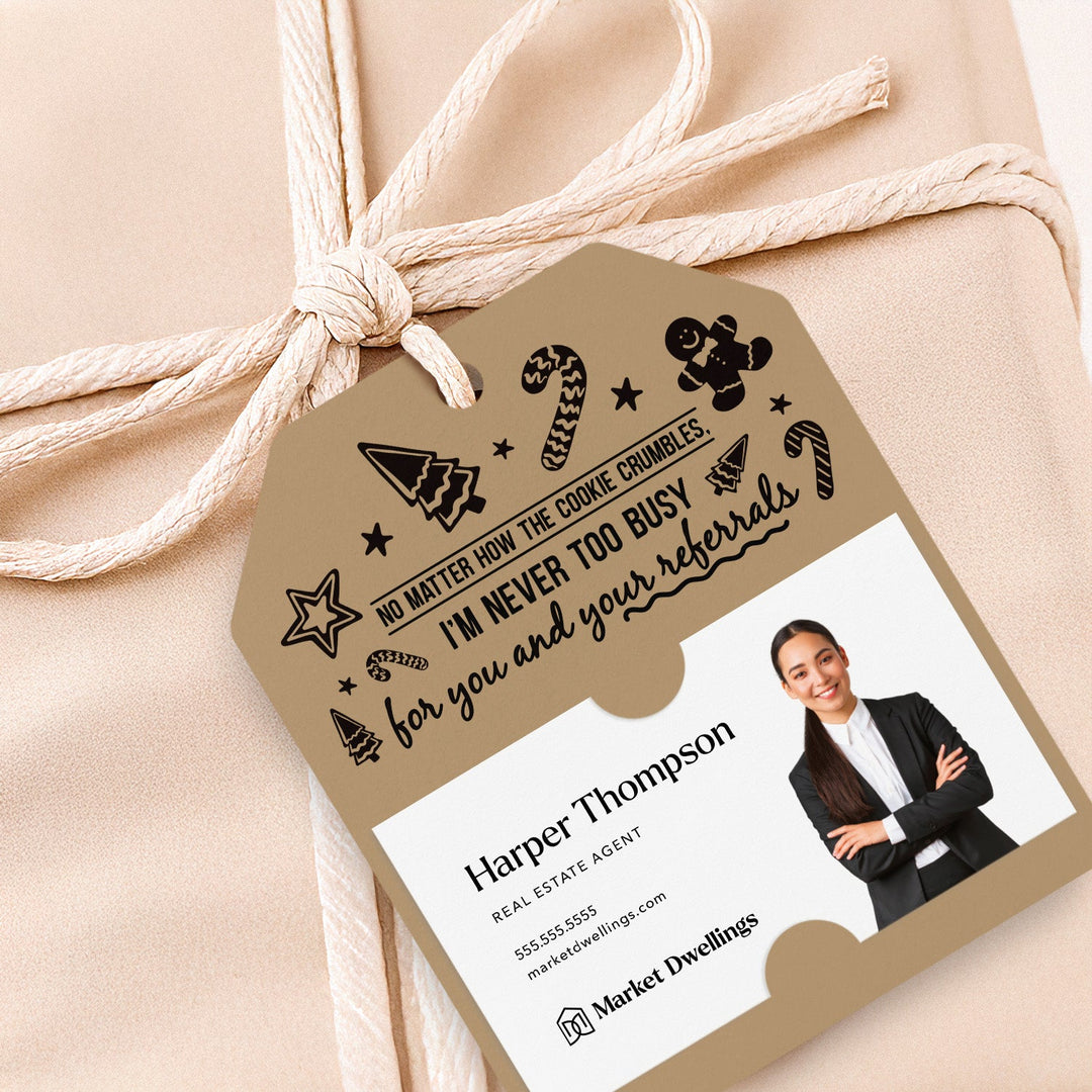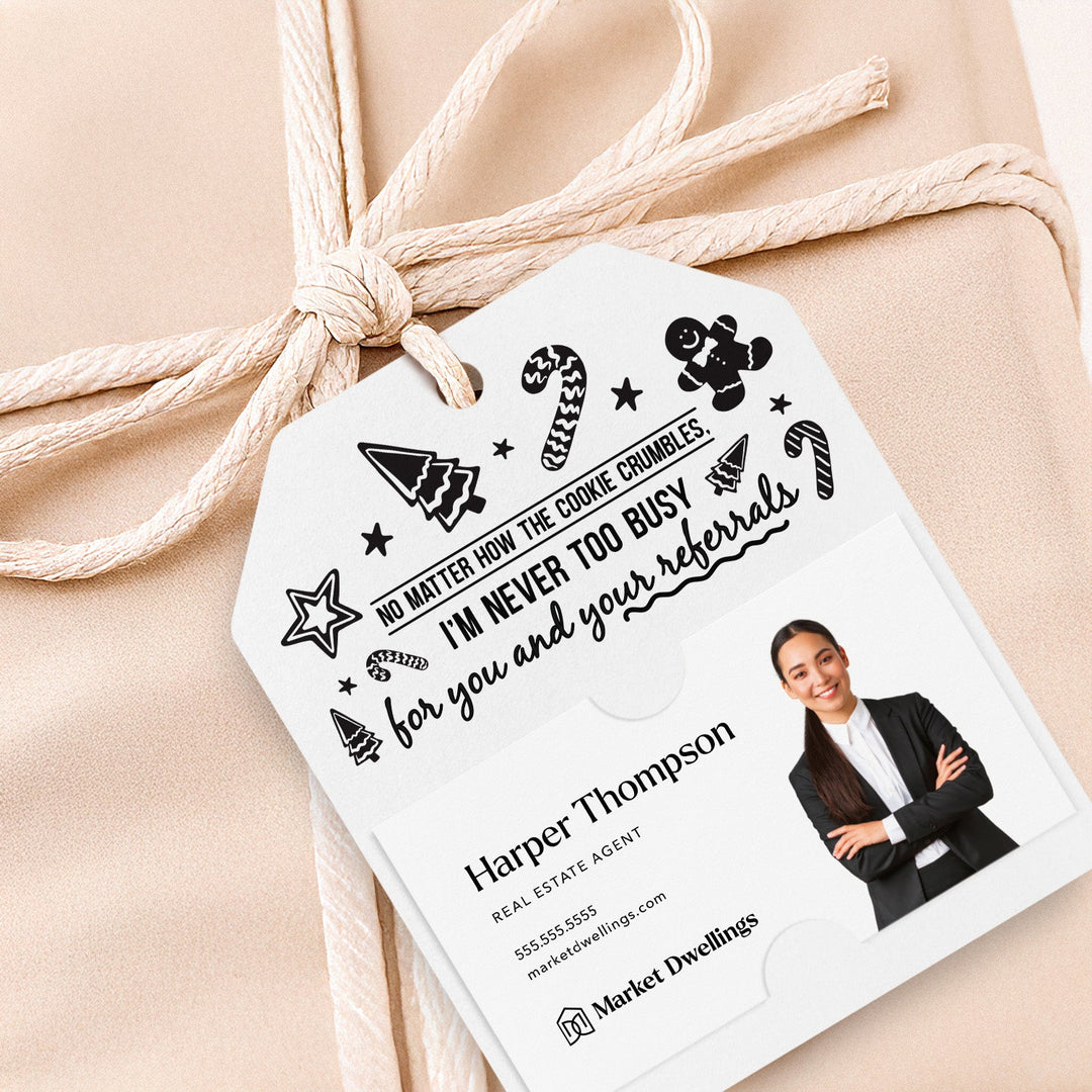 Attention all real estate agents! As the holiday season approaches, it's the perfect time to show your clients how much you appreciate their business and strengthen your professional relationships. Introducing our No Matter How The Cookie Crumbles Christmas Cookie Gift Tags - the perfect way to add a personal touch to your gifts and showcase your branding. These thoughtfully designed gift tags feature slots to hold your business card, making them a powerful marketing tool that will leave a lasting impression on your clients. Show your clients that you value their business and take your marketing efforts to the next level with our festive and professional gift tags.