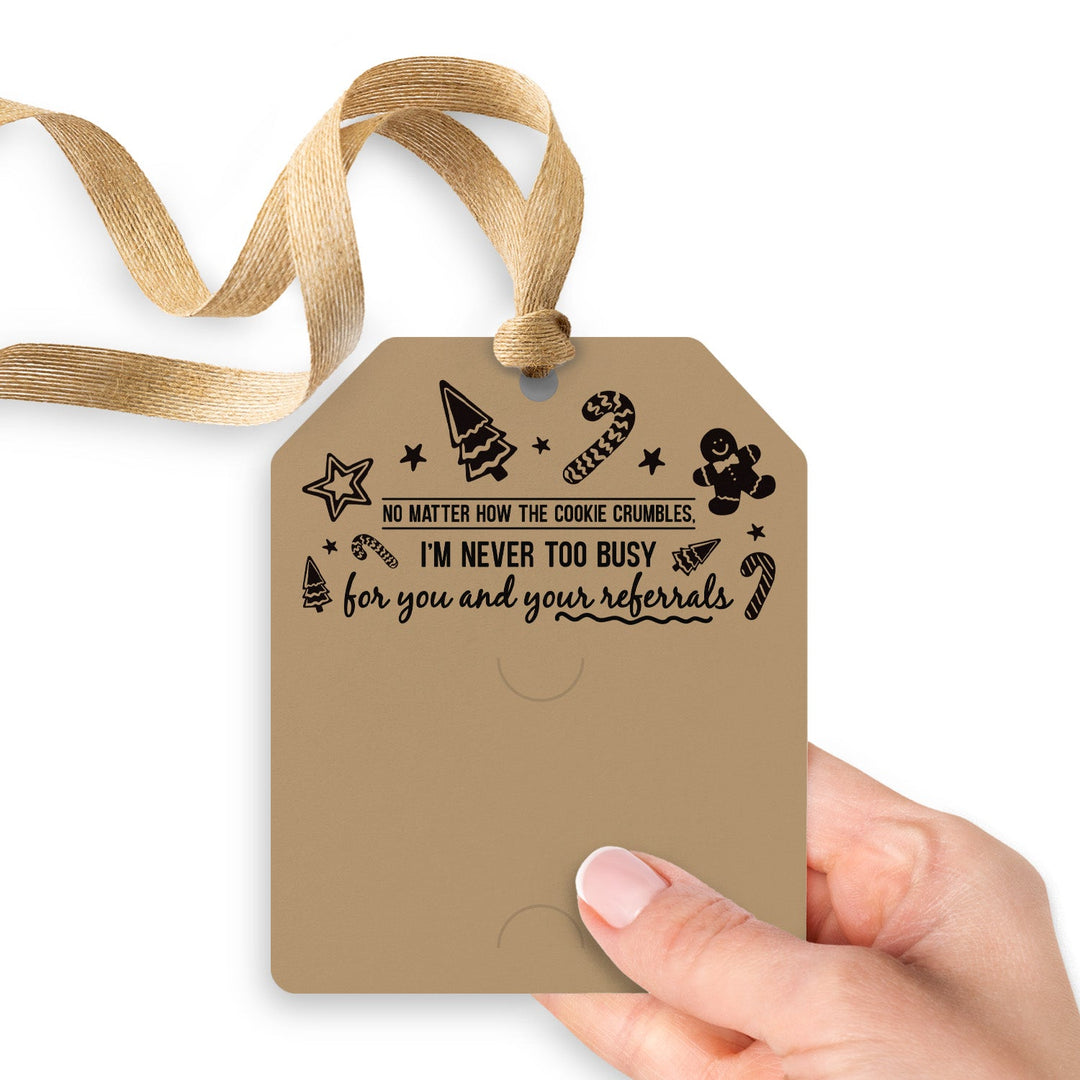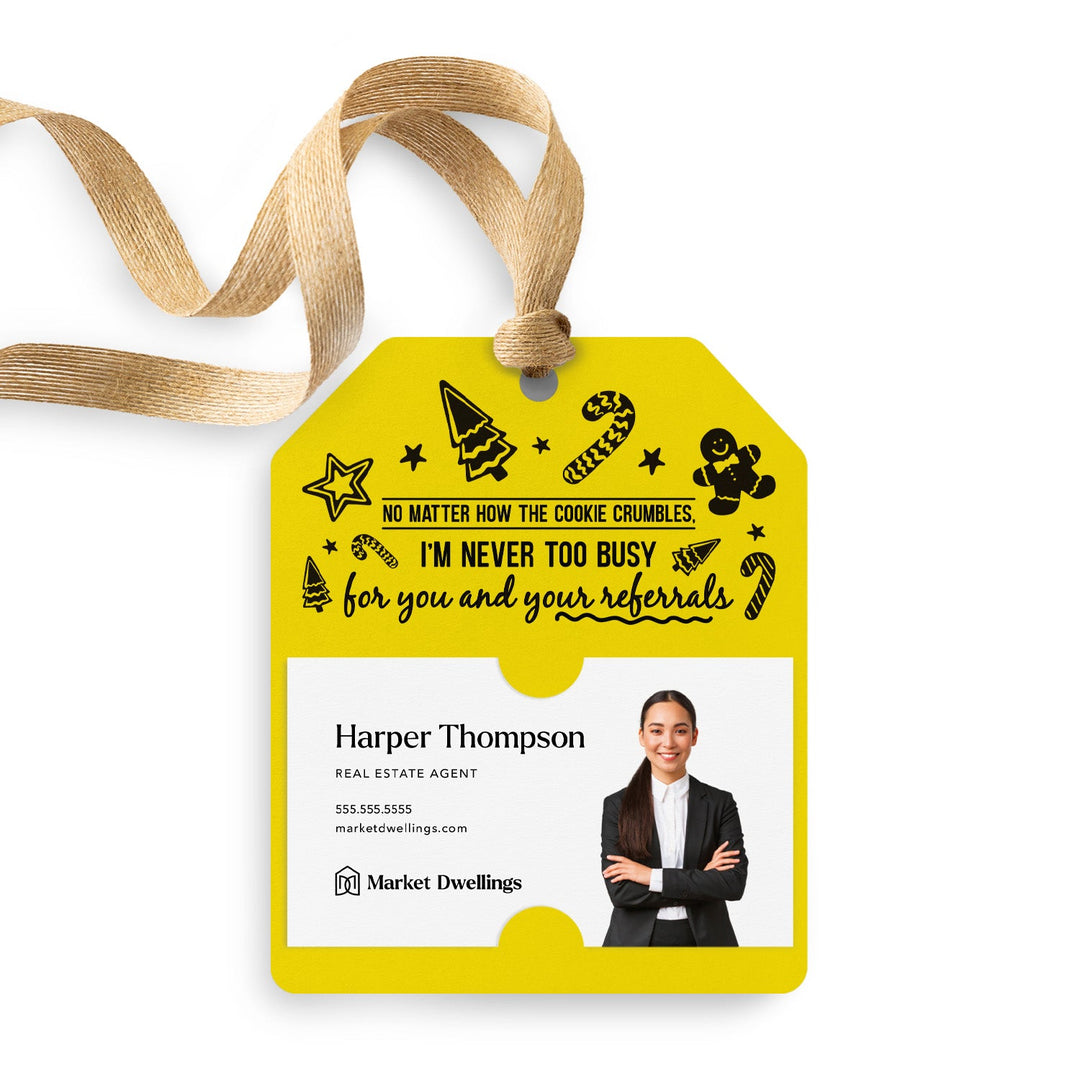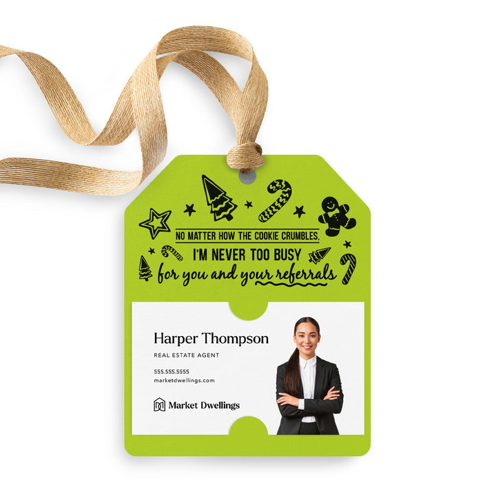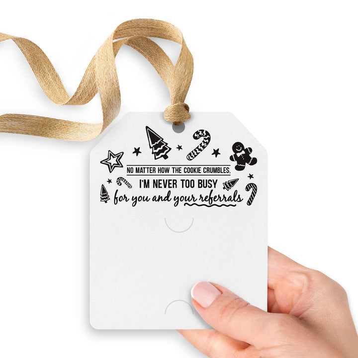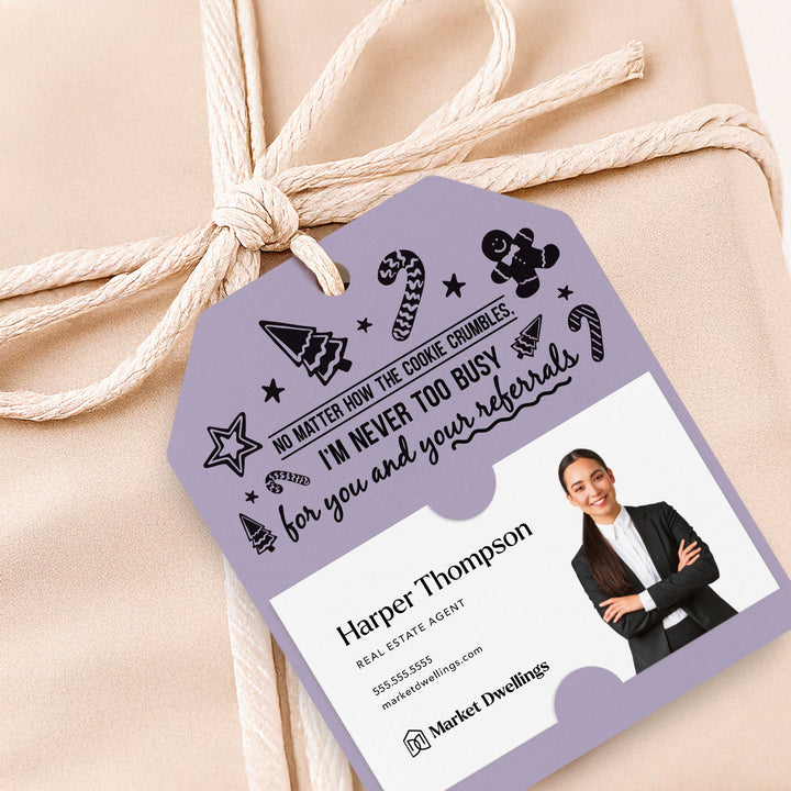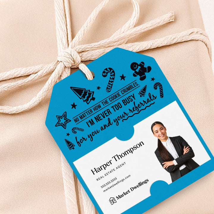 Attention all real estate agents! As the holiday season approaches, it's the perfect time to show your clients how much you appreciate their business and strengthen your professional relationships. Introducing our No Matter How The Cookie Crumbles Christmas Cookie Gift Tags - the perfect way to add a personal touch to your gifts and showcase your branding. These thoughtfully designed gift tags feature slots to hold your business card, making them a powerful marketing tool that will leave a lasting impression on your clients. Show your clients that you value their business and take your marketing efforts to the next level with our festive and professional gift tags.