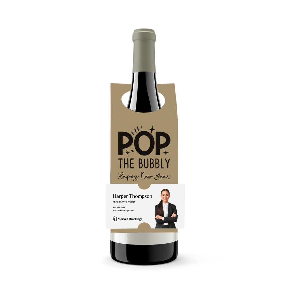 New Year bottle tags, customizable bottle hang tags, festive wine tags, client appreciation tags, professional real estate tags, personalized bottle tags, branded holiday tags, real estate marketing tools, realtor promotional materials, seasonal gift tags, holiday branding tools, thoughtful client gifts, business card bottle tags, celebratory marketing tools, client engagement tools, real estate branding materials.