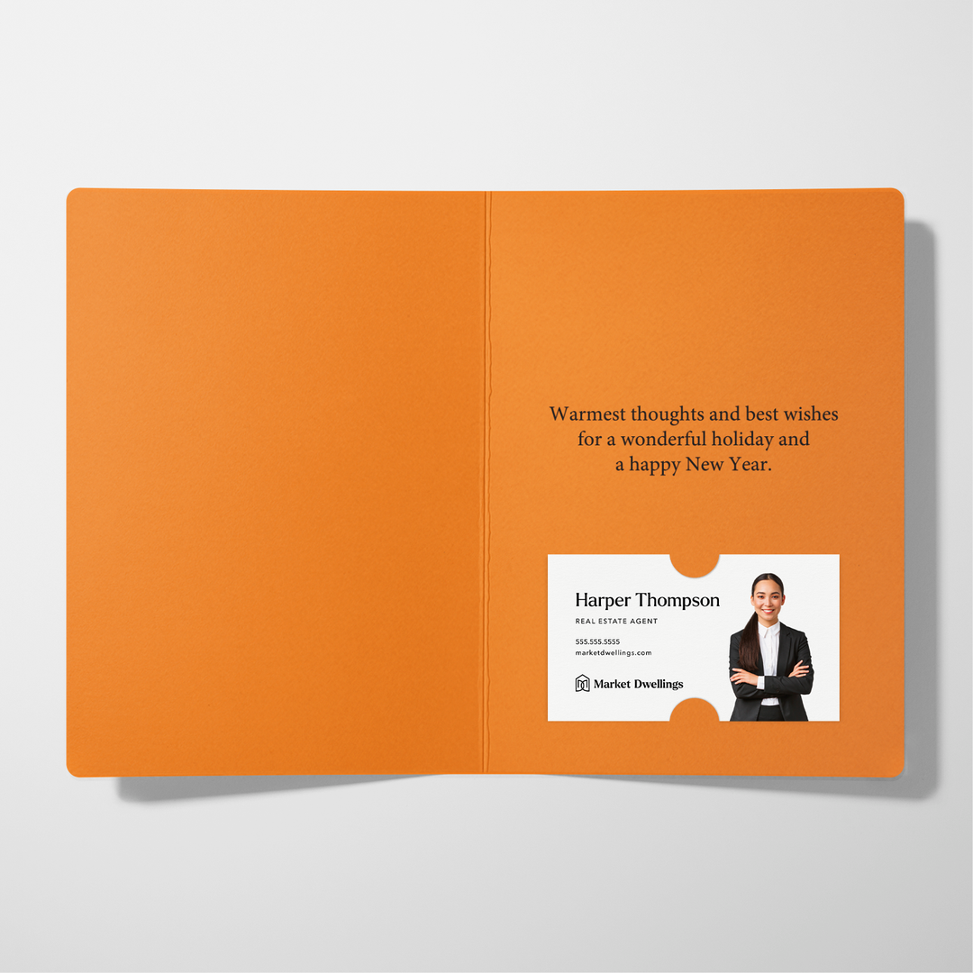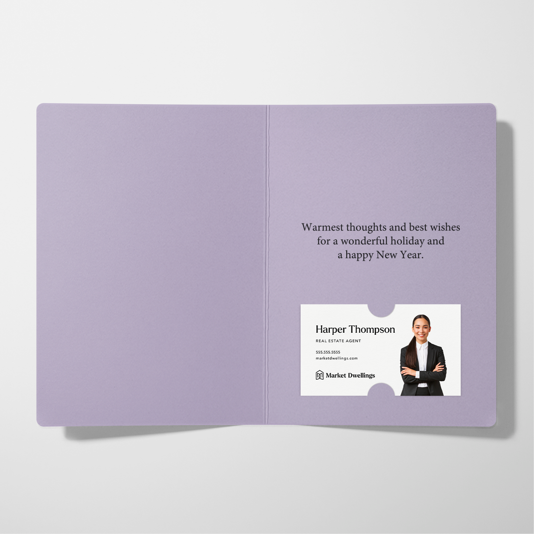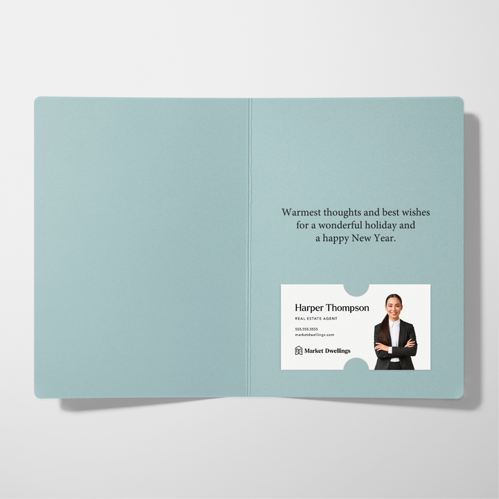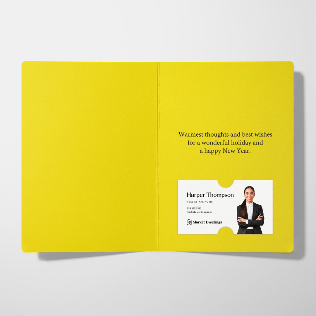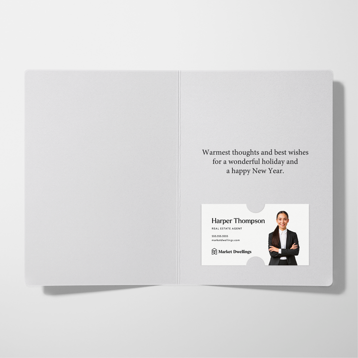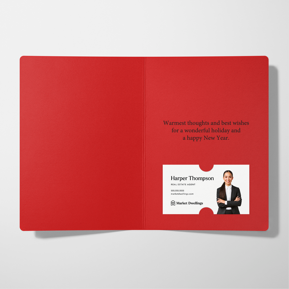 holiday real estate greeting card, festive realtor marketing materials, business card greeting cards, customizable holiday card for agents, client outreach tools for real estate agents, professional holiday cards for realtors, Christmas real estate marketing, holiday cards with business card slot, easy peel-and-stick envelopes.