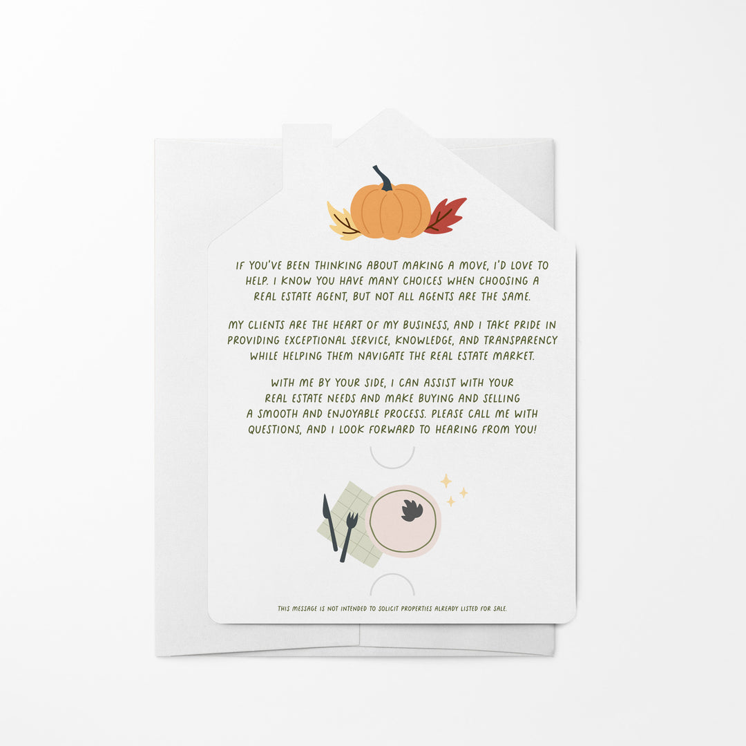Real Estate Agents: Send these mailers to clients and prospects and tell them why Fall/Thanksgiving is a great time to buy or sell while staying top-of-mind! This item is sold in white envelopes. There are slots on the card for you to slide your business card in. These will stand out from other mailers and create a memorable experience when opened.