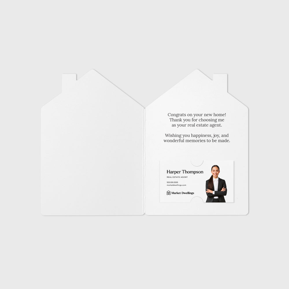 Real Estate Agents: Give your clients a beautiful card on the closing day of their home purchase! These cards have a pre-written message inside. Cards also have slots for you to slide your business card in. The inside wording reads: Congratulations on your new home! Thank you so much for choosing me as your real estate agent. Wishing you happiness, joy, and wonderful memories to be made.