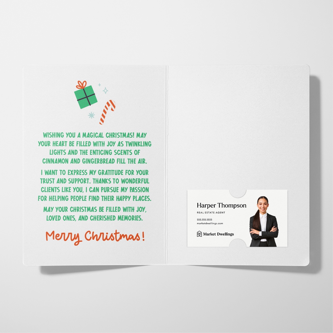 Elevate the festive spirit by surprising your clients with a heartwarming real estate greeting card! Make it a season of happy connections and show them how much you appreciate their business. The cards even have a spot to hold your business card, and the envelopes are included for your convenience.