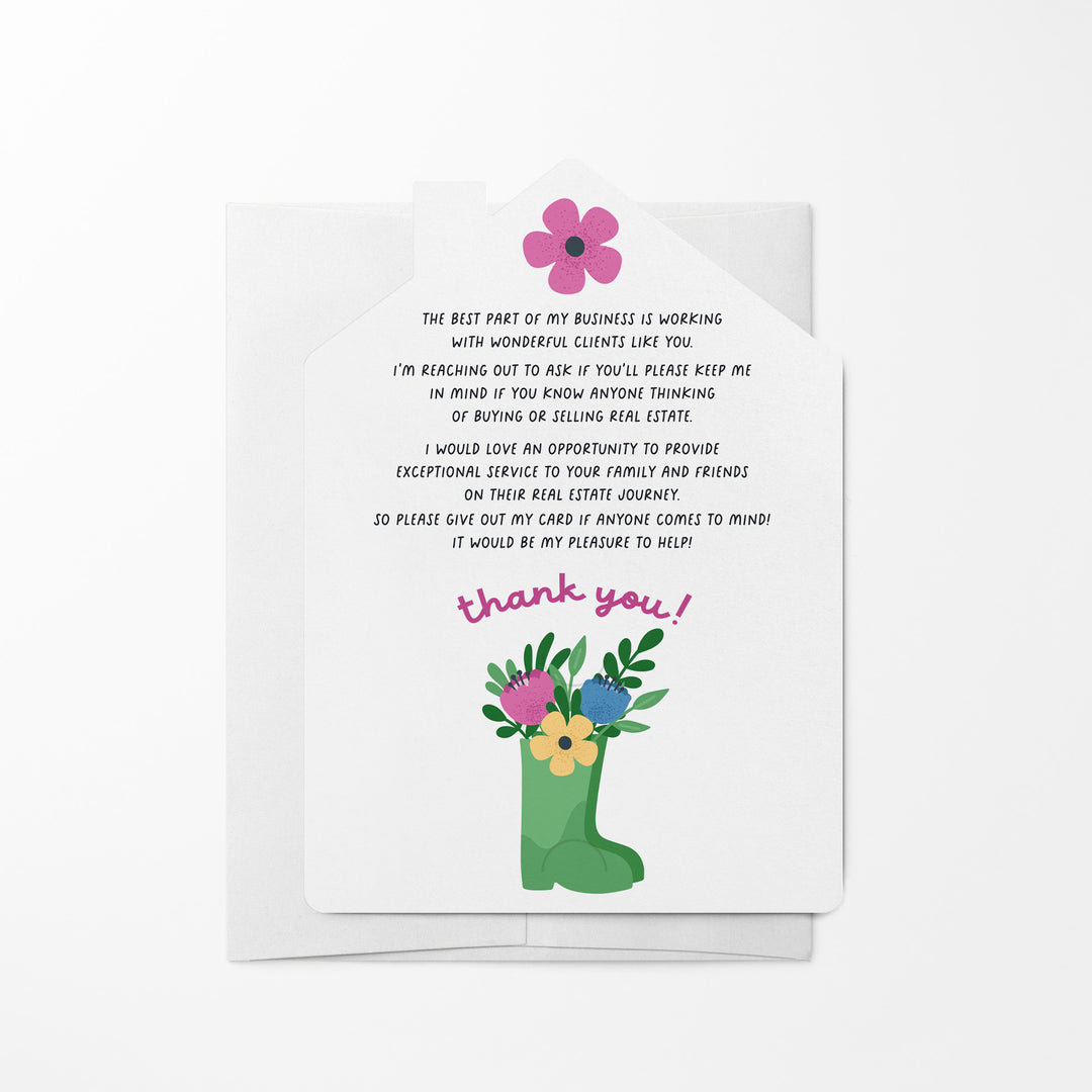 Send these adorable spring mailers to homes in your target market. You can even slide your business card in the slots provided, so the homeowner can call you when they need a real estate agent! White envelopes included.