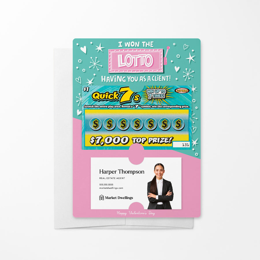 Celebrate your clients this Valentine's Day with our I Won The Lotto Having You As A Client Mailers w/ Envelopes! These charming and festive mailers are a heartfelt way to show your appreciation for their business and referrals. Featuring a Valentine's-themed design with slots for a scratch-off ticket and your business card, these mailers combine love and professionalism in a memorable package. Each mailer includes an easy peel-and-stick white envelope for hassle-free mailing.