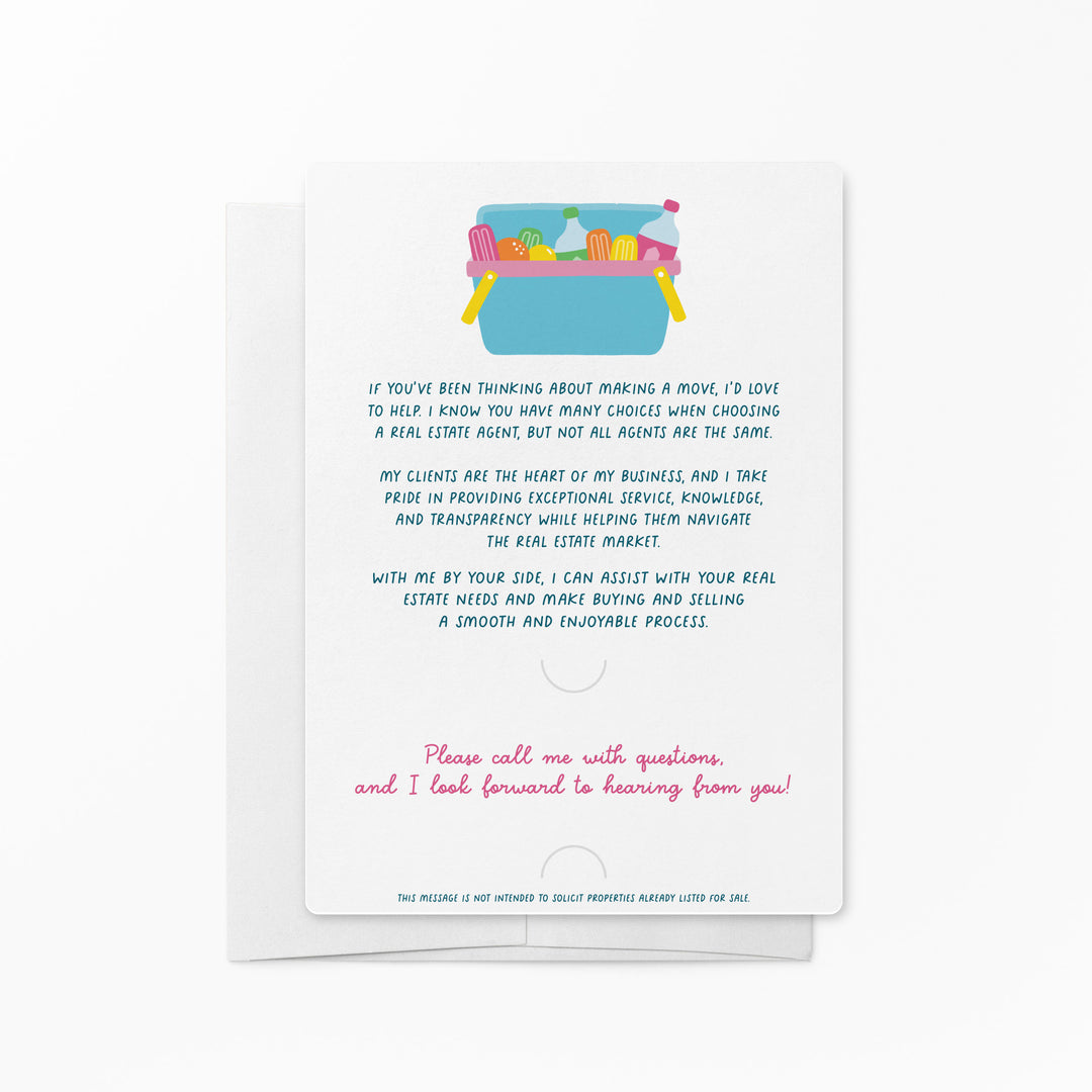 Send these adorable summer cooler mailers to homes in your target market. You can even slide your business card in the slots provided, so the homeowner can call you when they need a real estate agent! White envelopes included.