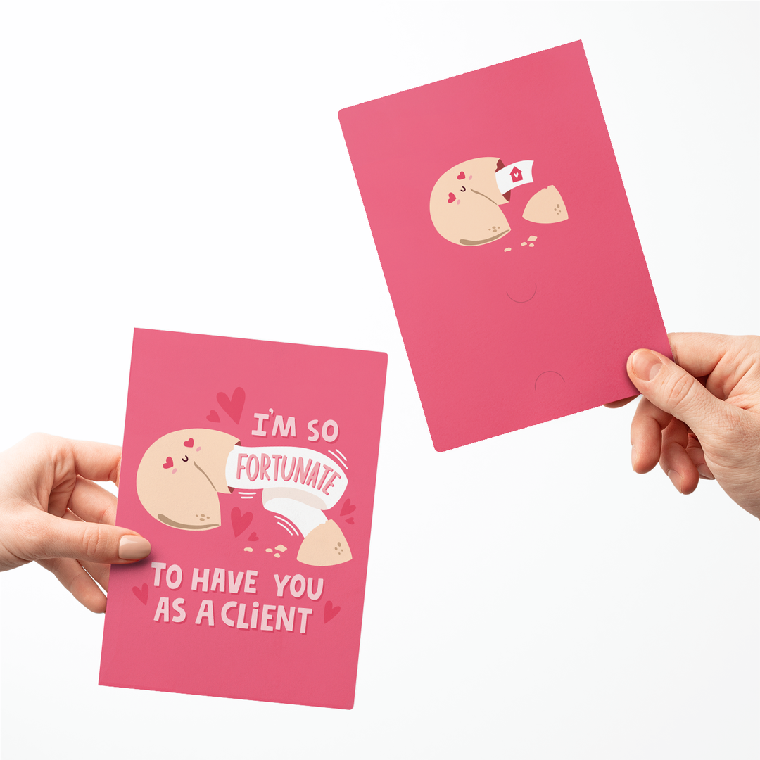 Express your gratitude with a unique twist this Valentine’s Day using the I’m So Fortunate To Have You As A Client fortune cookie-themed greeting cards. These cards are a creative and heartfelt way to show appreciation while building stronger client relationships.
