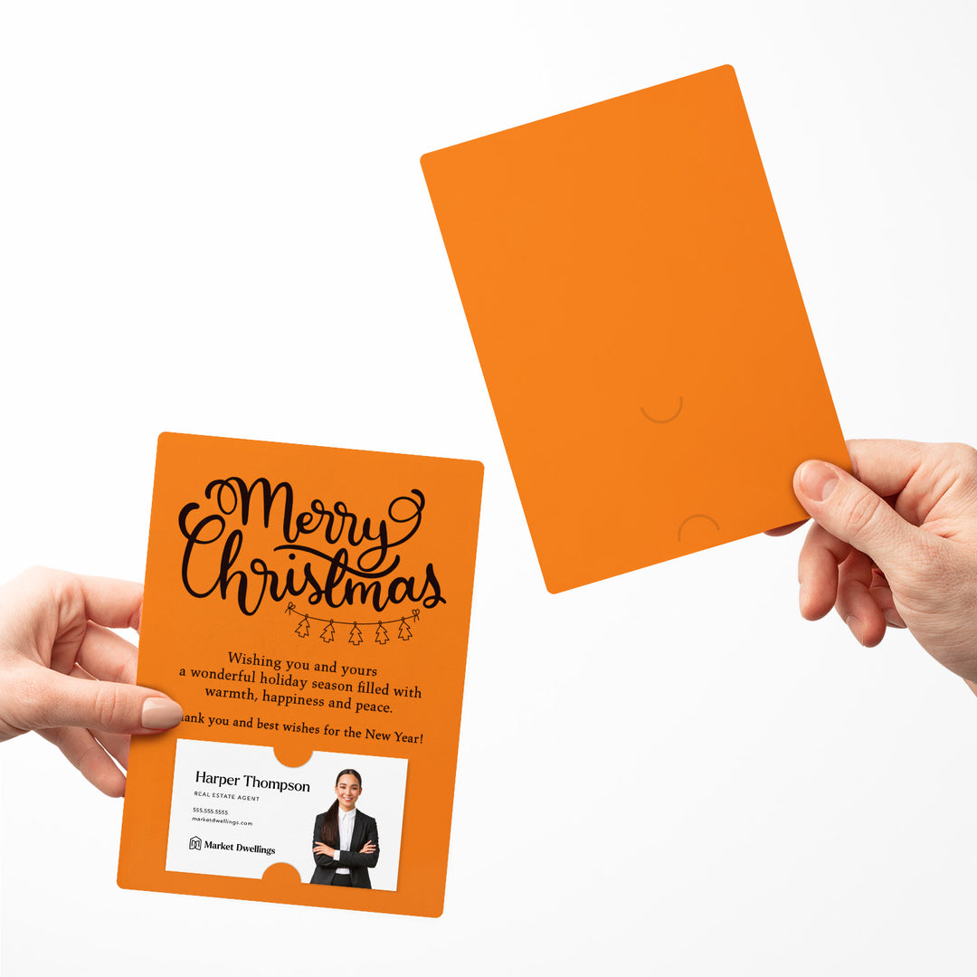 Send these mailers to new and existing clients to keep your business flowing through the Holiday season! These cards are single-sided and have slots for you to slide your business card in. This item is sold in sets and comes with white envelopes.