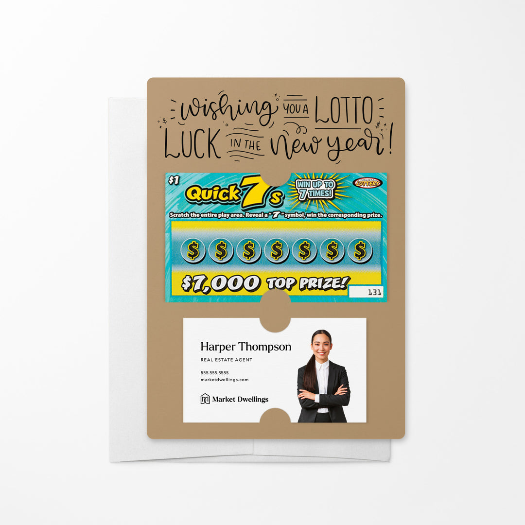 New Year mailers, customizable scratch-off mailers, client appreciation mailers, real estate marketing tools, professional festive mailers, personalized lotto mailers, branded scratch-off mailers, real estate lotto mailers, realtor promotional materials, cheerful client gifts, business card mailers, scratch ticket mailers, creative festive outreach, client engagement tools, real estate branding materials.