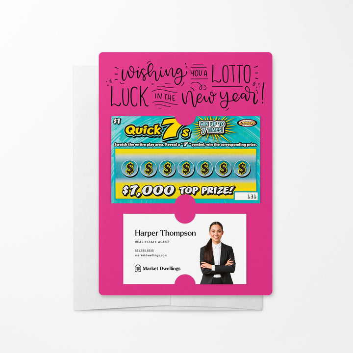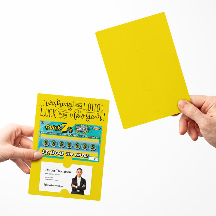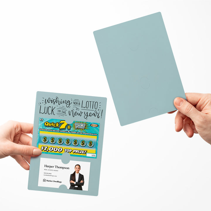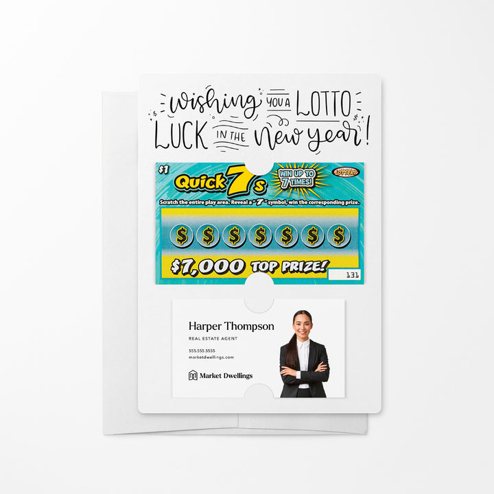 Welcome the new year with our Wishing You a LOTTO Luck in the New Year Mailers w/ Envelopes! These cheerful and engaging mailers are a thoughtful way to connect with your clients and show your appreciation for their business and referrals. Featuring slots for a scratch-off ticket and your business card, these mailers bring a perfect blend of seasonal charm and professional branding. Each mailer comes with an easy peel-and-stick white envelope for convenient and hassle-free mailing.