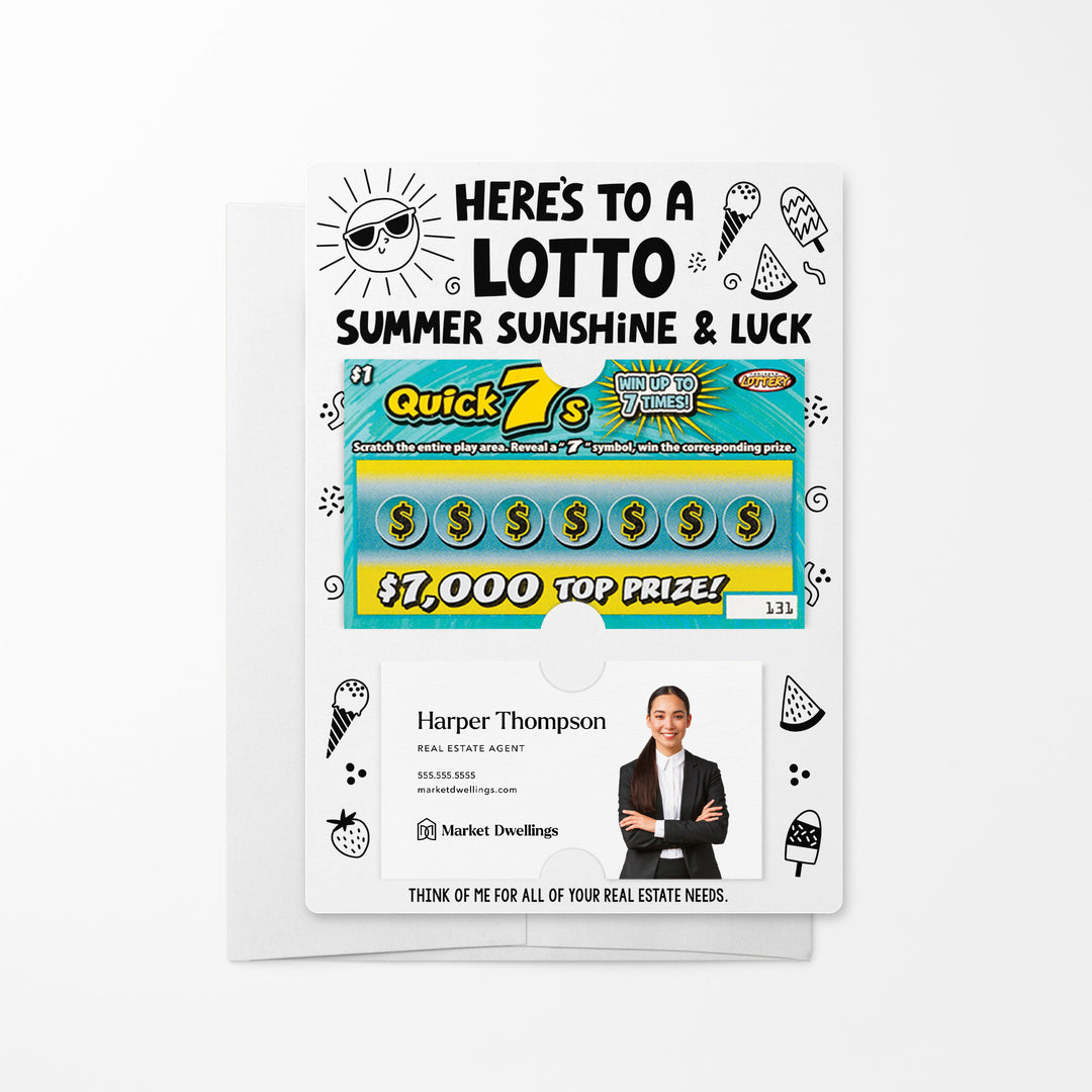 Brighten your clients' summer with our Here's to a LOTTO Summer Sunshine and Luck Mailers w/ Envelopes! These vibrant and cheerful mailers are the perfect way to show your appreciation for their business and referrals during the sunny season. Featuring slots for a scratch-off ticket and your business card, these mailers blend summer charm with professional branding. Each mailer includes an easy peel-and-stick white envelope for convenient mailing.