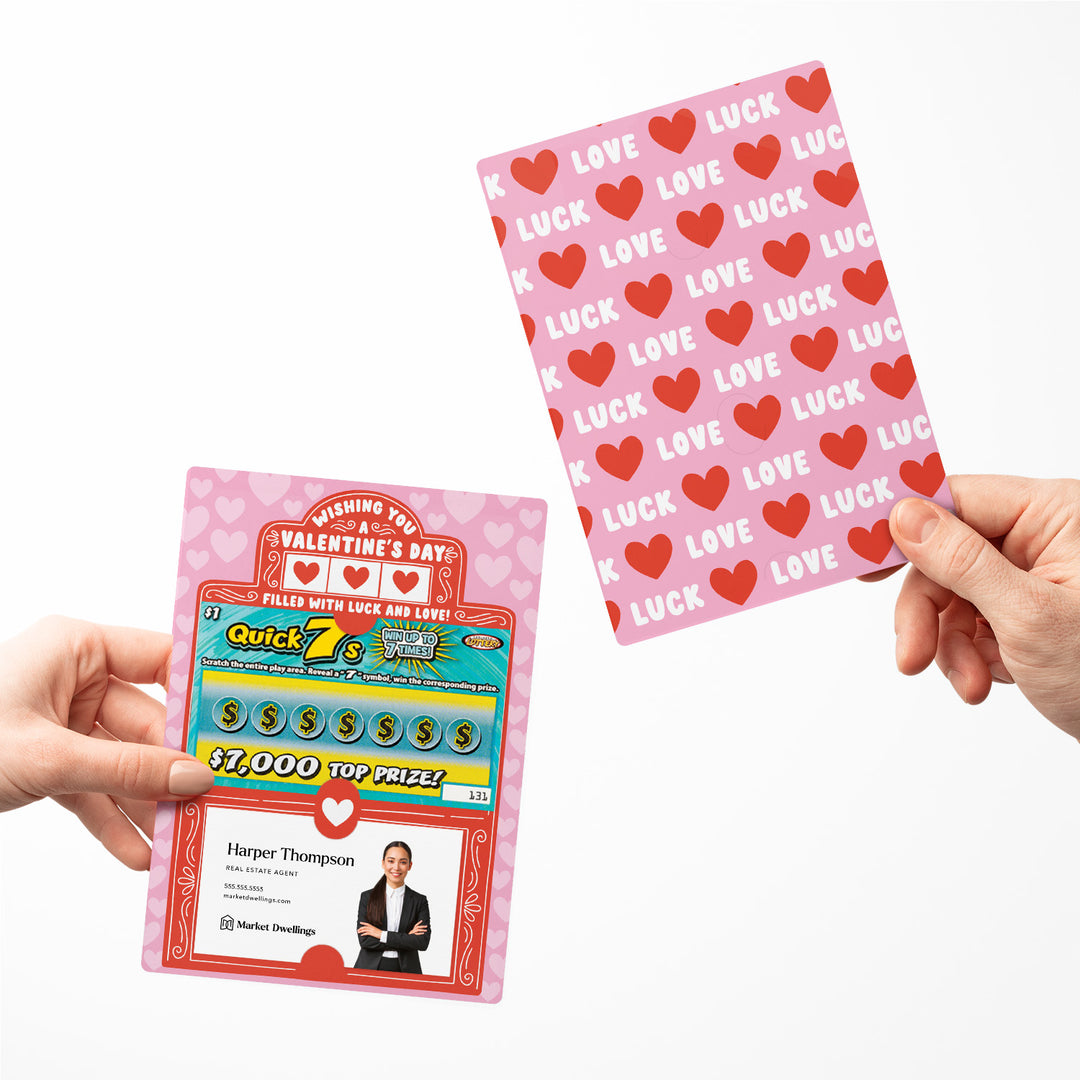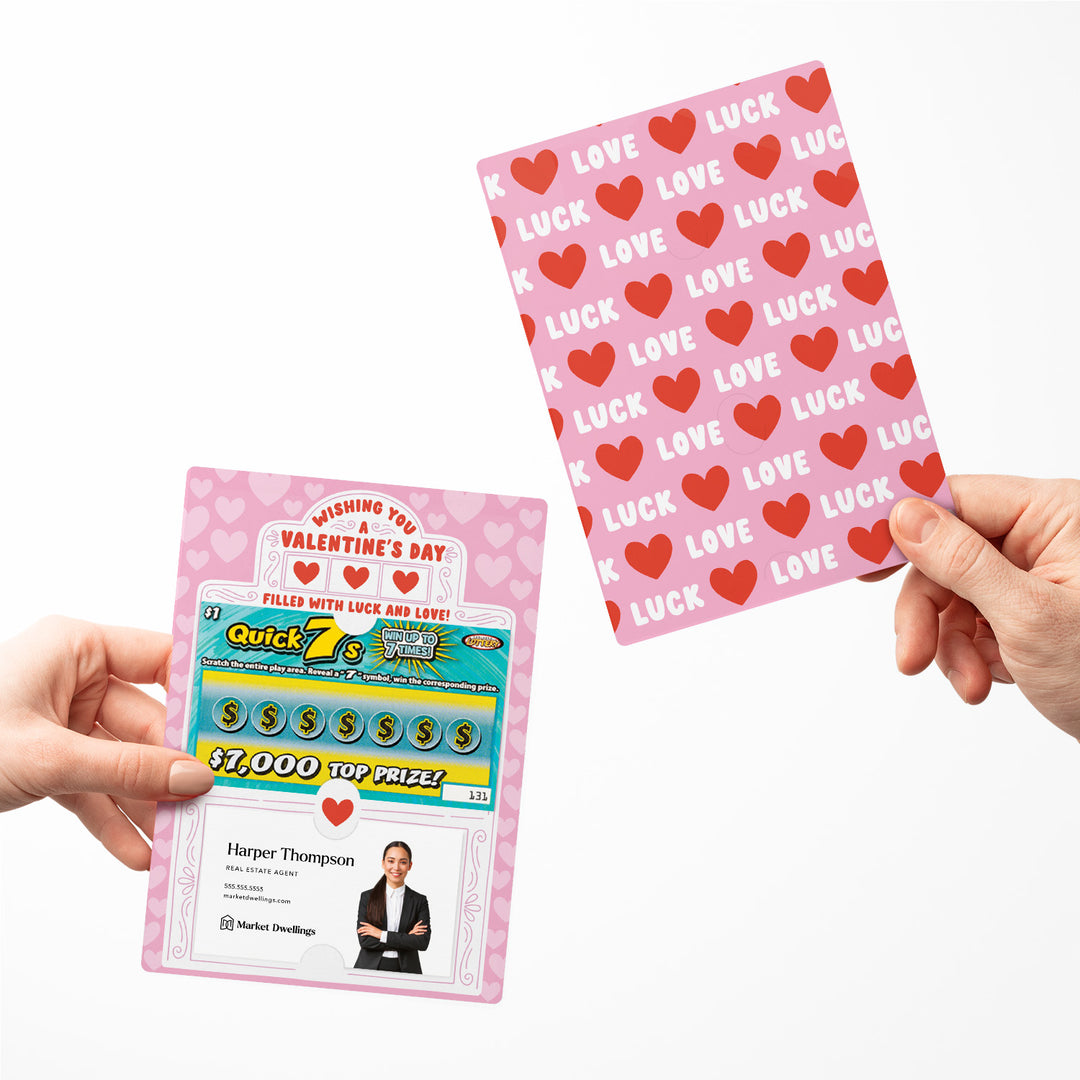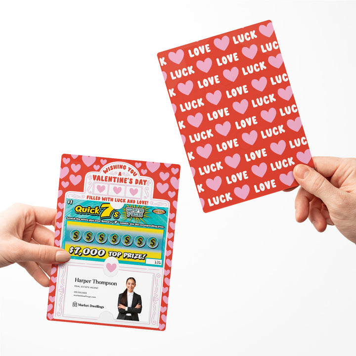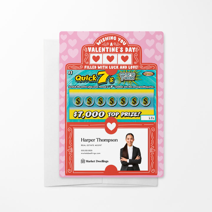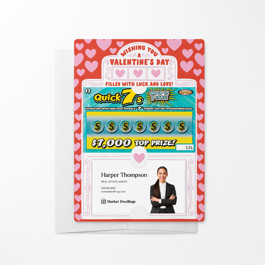 Celebrate the season of love with our Wishing You a Valentine's Day Filled with Luck and Love! Mailers w/ Envelopes! These Valentine's Day-themed mailers are a thoughtful way to connect with your clients and show your appreciation for their business and referrals. Featuring slots for a scratch-off ticket and your business card, these mailers combine the charm of Valentine's Day with professional branding. Each mailer includes an easy peel-and-stick white envelope for hassle-free mailing.