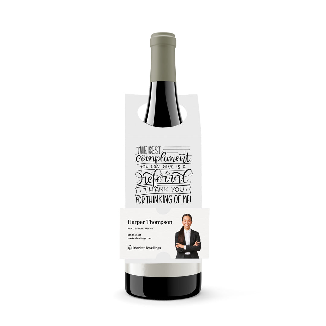 These The Best Compliment You Can Give is a Referral Bottle Hang Tags are a subtle and effective way to encourage referrals while expressing gratitude. Attach them to bottles of wine, bubbly beverages, or thoughtful gifts as a memorable way to stay top-of-mind with clients. The elegant design ensures your gesture feels heartfelt and professional.