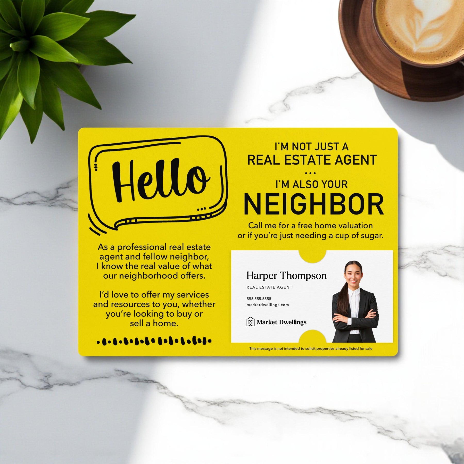 Build stronger connections with our I’m Not Just a Real Estate Agent, I’m Also Your Neighbor Mailers w/ Envelopes! These thoughtful and engaging mailers are a perfect way to introduce yourself to clients and show your commitment to the community. Featuring a slot for your business card, these mailers combine personal warmth with professional branding. Each mailer includes an easy peel-and-stick white envelope for hassle-free mailing.