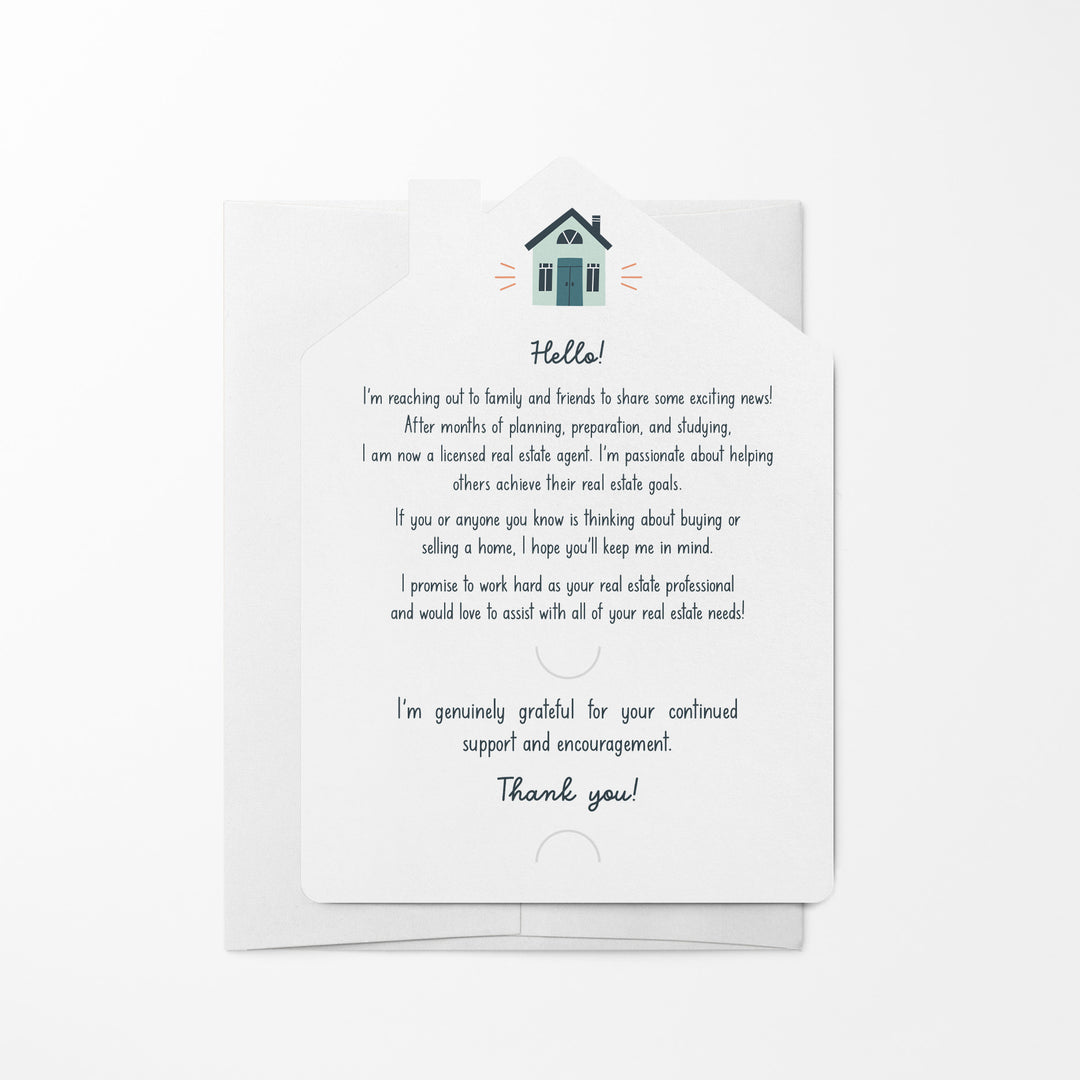 Did you just become a real estate agent? Don't keep it a secret! The best way to start prospecting for your business is to send this card to anyone and everyone you can think of. Your friends and family will always be a great source of business and referrals. You'll be surprised at the great response you receive! There are slots for you to slide your business card in so they can call you when they are ready for your services. There is a pre-written message on the backside of the mailer.