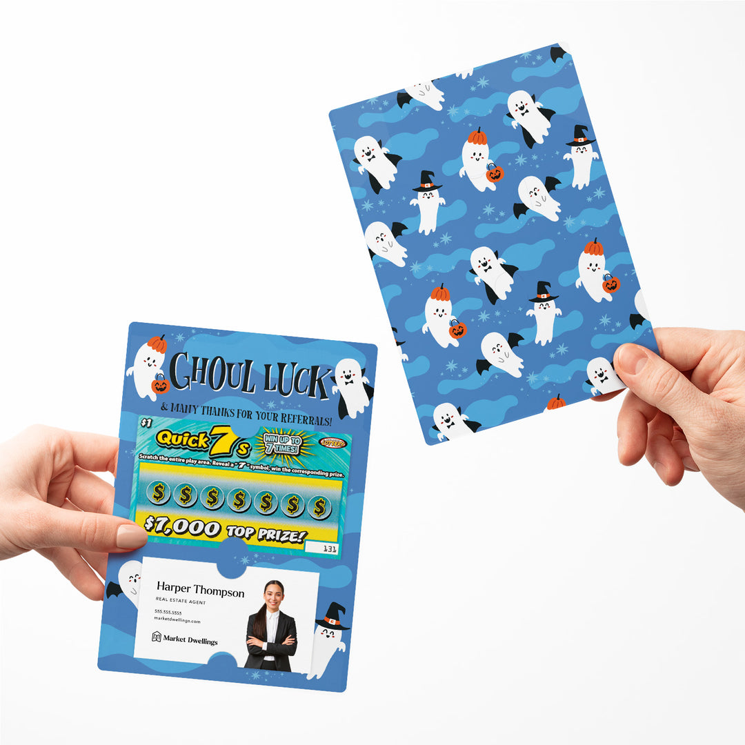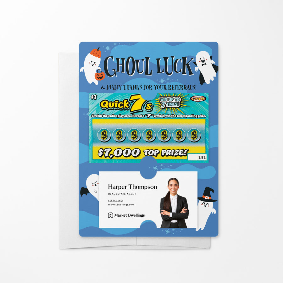 Send a spooktacular message of gratitude with our Ghoul Luck And Many Thanks For Your Referrals! Mailers w/ Envelopes! These Halloween-themed mailers are the perfect way to show your appreciation for your clients and their referrals. Featuring slots for a scratch-off ticket and your business card, these mailers blend festive fun with professional branding. Each one includes an easy peel-and-stick white envelope, ensuring they're simple and hassle-free to send.