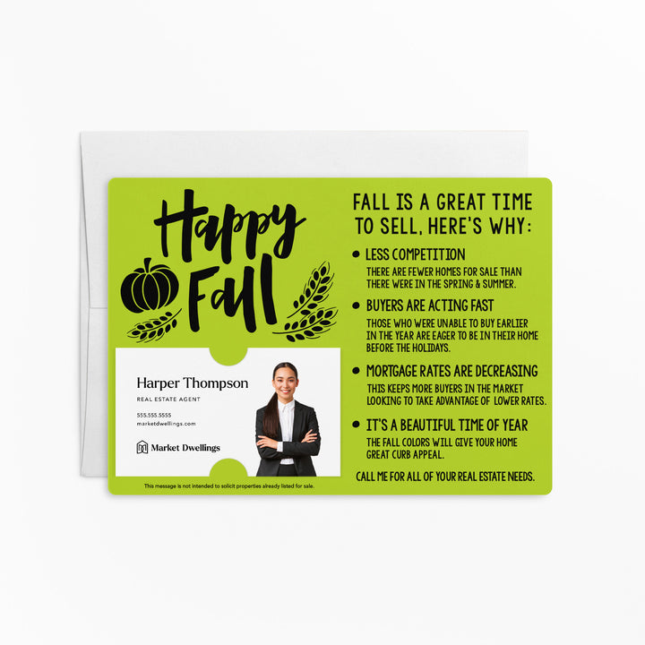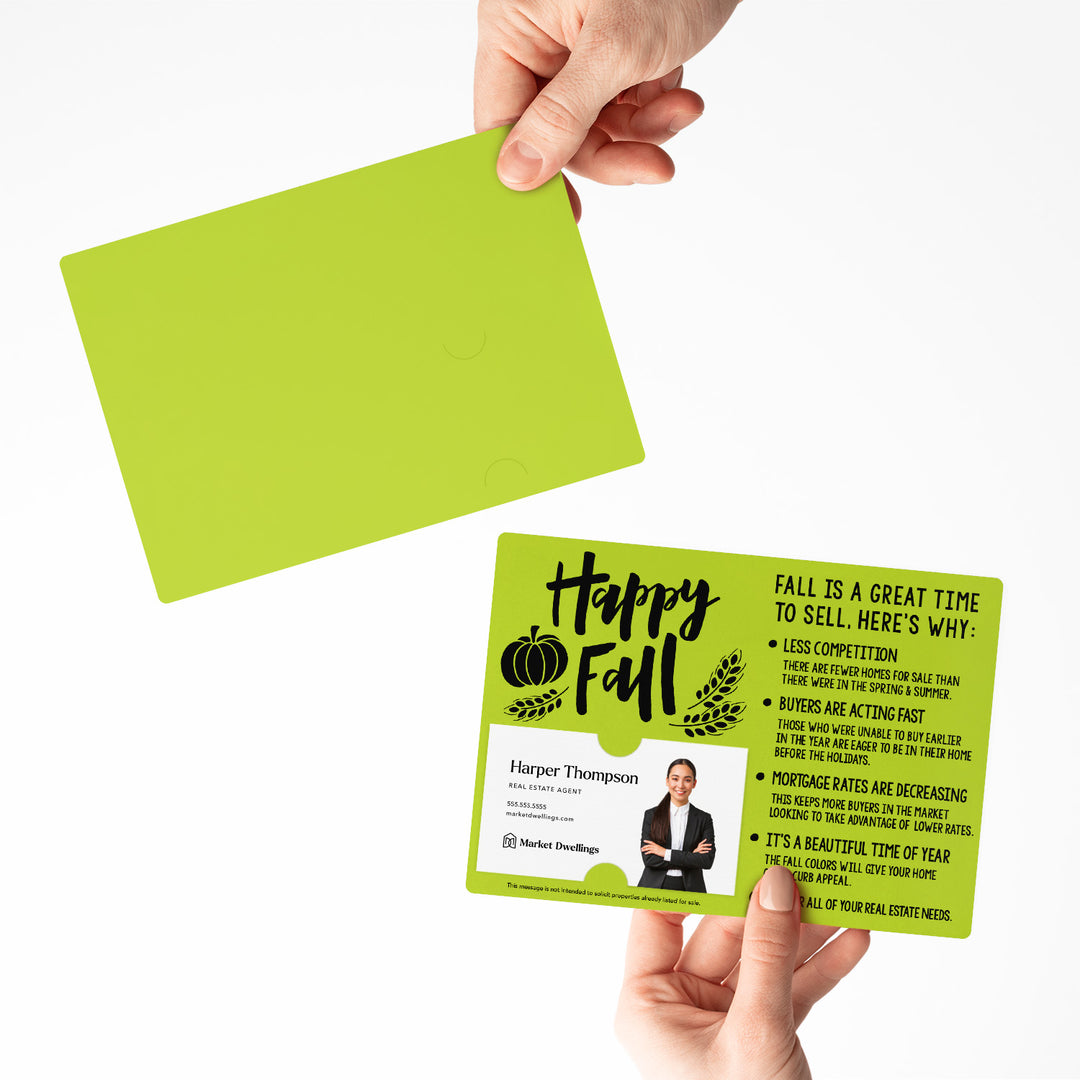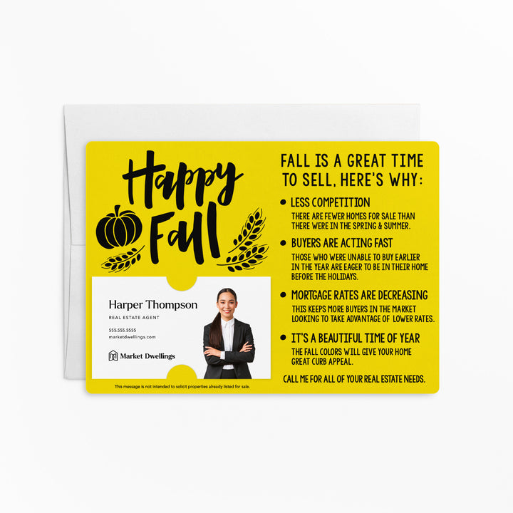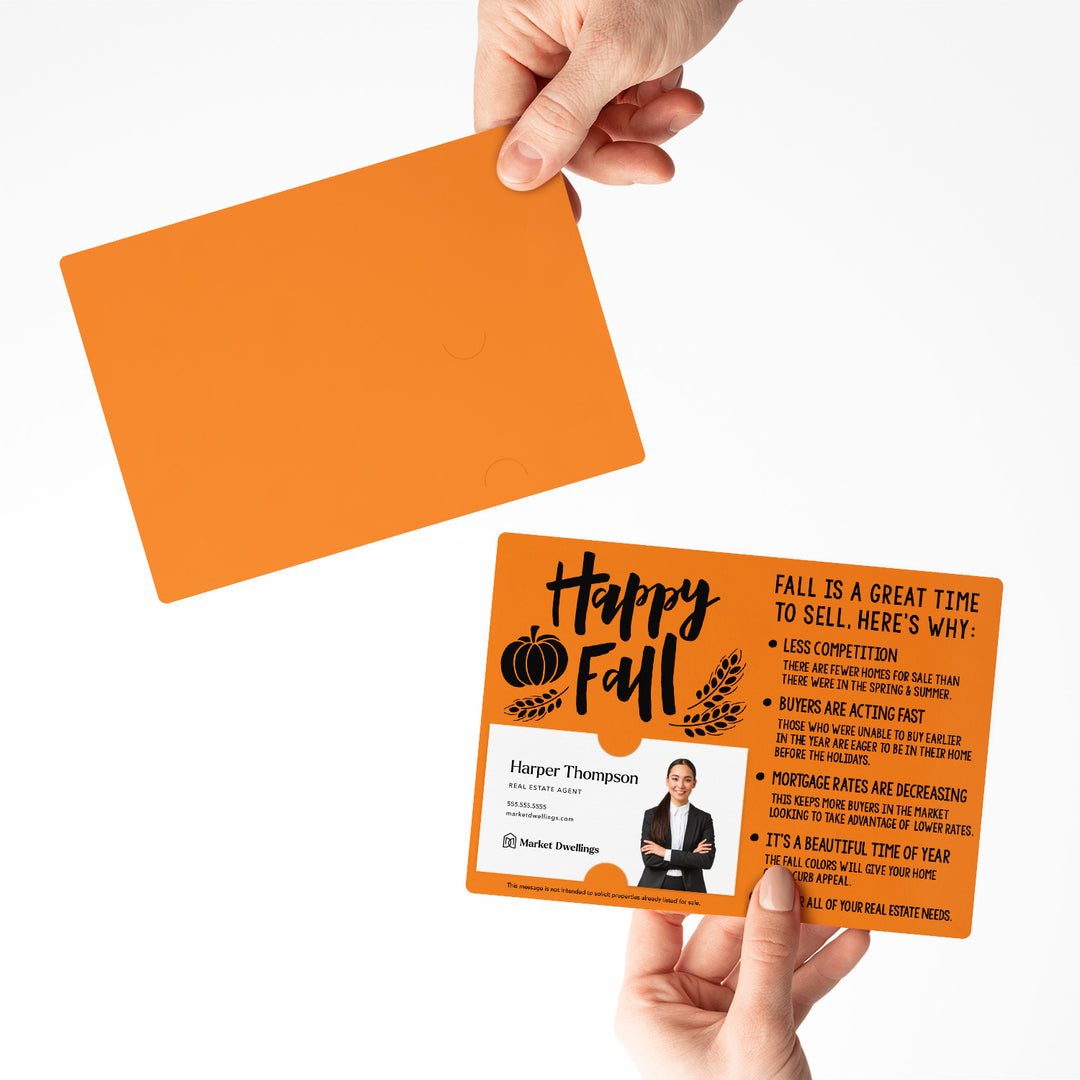 Real Estate Agents: Send these Mailers to clients and prospects and let them know why Fall is a great time to sell while staying top-of-mind! This item is sold with white envelopes. There are slots on the card for you to slide your business card in. These will stand out from other mailers and create a memorable experience when opened.