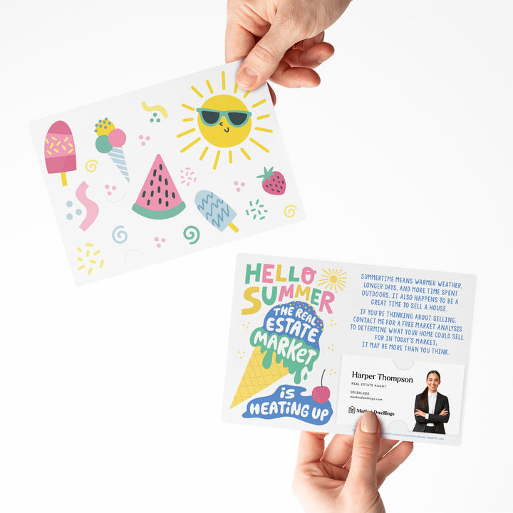 Real Estate Agents: Stay top of mind this Summer, with these awesome mailers. These cards are double-sided and have slots for you to slide your business card in. This item comes with white envelopes.