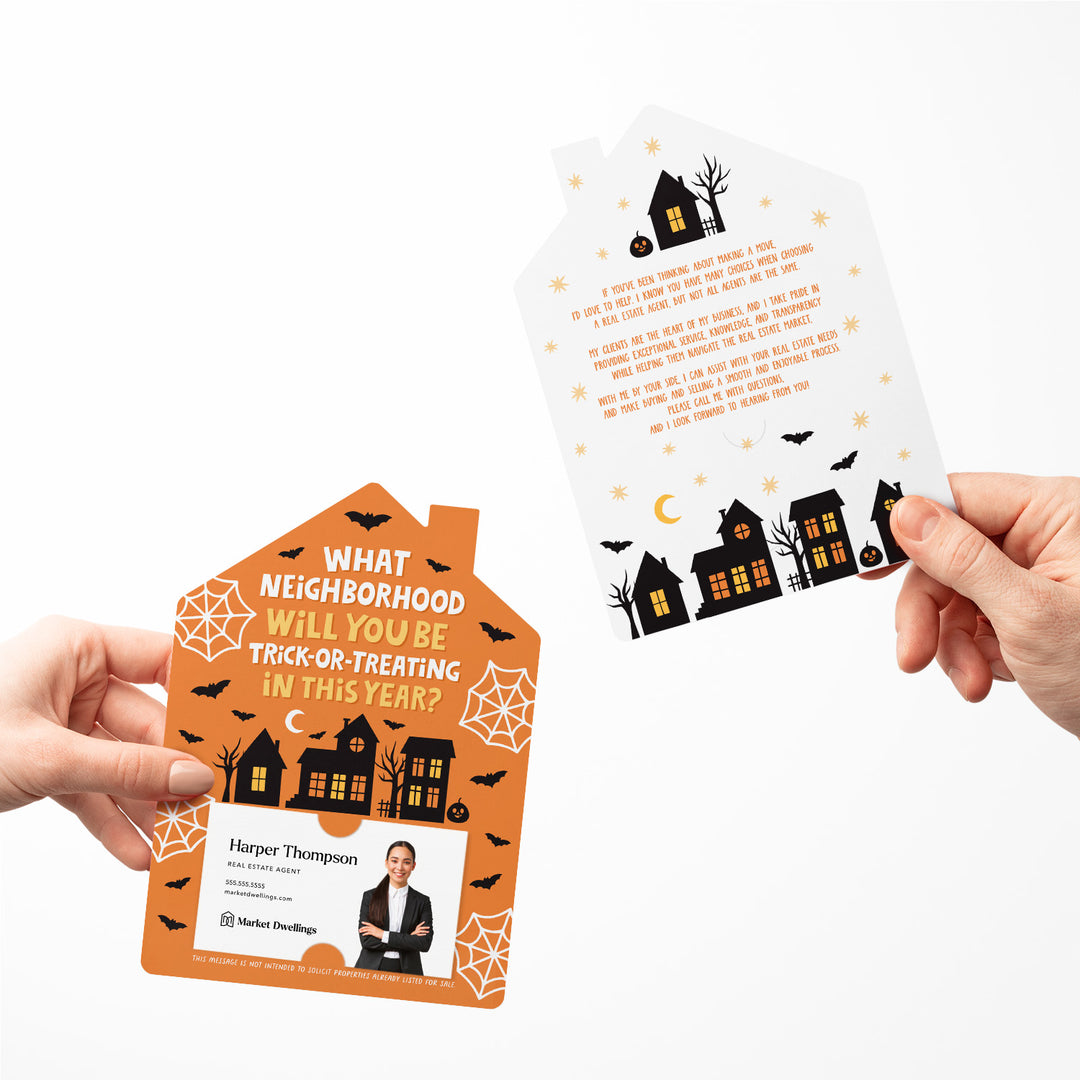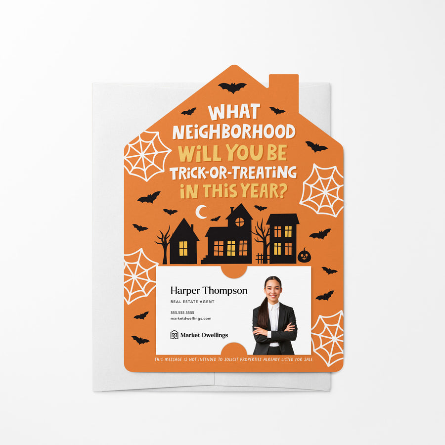 Set of What Neighborhood Will You Be Trick-Or-Treating In This Year? Mailers | Halloween Real Estate | Envelopes Included | M74-M001