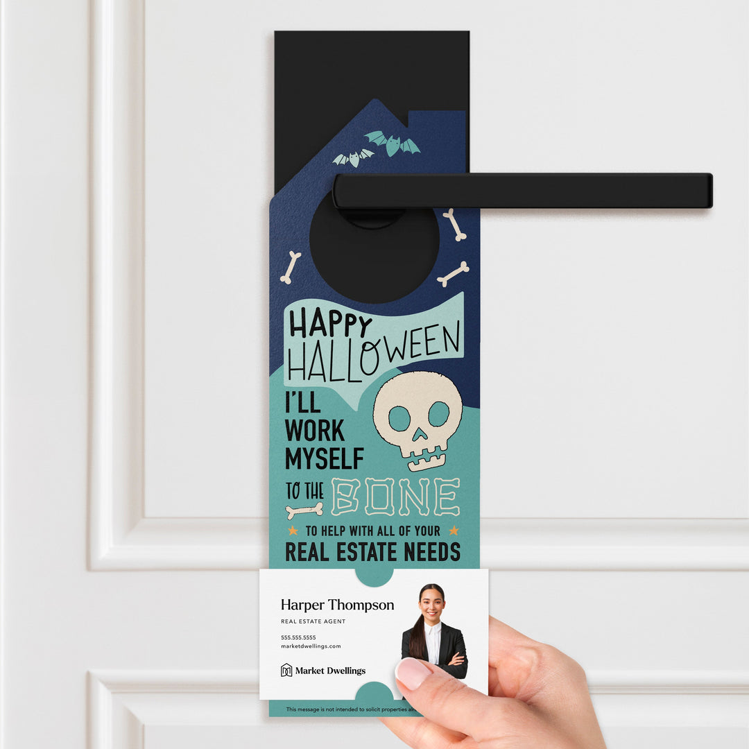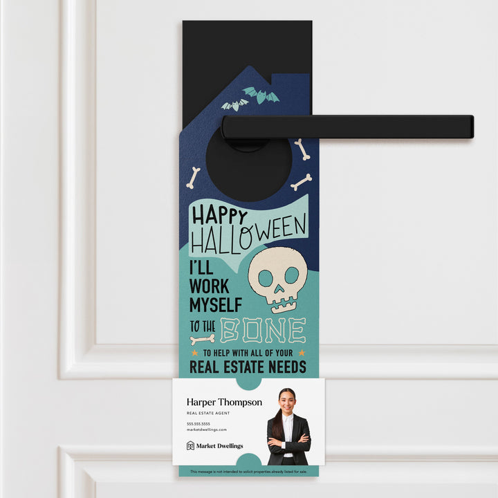 As a real estate agent, you know the importance of nurturing client relationships and standing out in a competitive market. That's why we've created the Happy Halloween I'll Work Myself to the Bone Real Estate Door Hangers. These eye-catching door hangers not only showcase your personality and professionalism, but also provide valuable information to potential clients. With slots to hold your business card, you can easily leave a lasting impression and grow your business this Halloween season. Don't miss out on this opportunity to stand out and connect with potential clients in a thoughtful and professional way. Order now and let your clients know that you'll work tirelessly for them, even on Halloween!