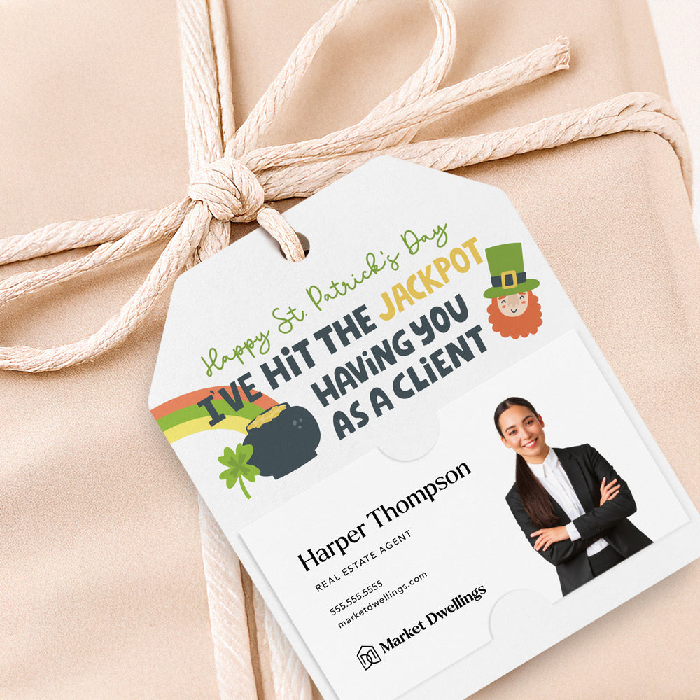 As a real estate professional, you know the importance of building strong and lasting relationships with your clients. That's why we've created these charming gift tags to help you make a lasting impression and show your clients how much you appreciate them. Crafted with high-quality materials and featuring a festive St. Patrick's Day design, these gift tags are the perfect way to add a personal touch to your pop by gifts. With a convenient slot to hold your business card, these tags not only showcase your thoughtfulness but also serve as a subtle marketing tool to keep you top-of-mind with your clients. Whether you're looking to nurture existing client relationships or attract new ones, these gift tags are sure to hit the jackpot. So spread some St. Patrick's Day cheer and let your clients know that they're your pot of gold at the end of the rainbow. Order yours today and watch your business grow!