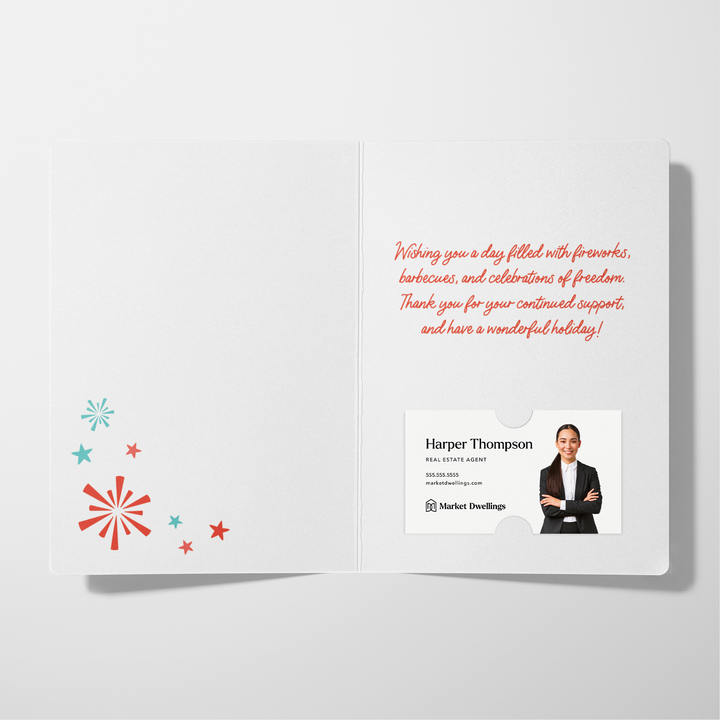 Give your new and current clients this adorable Fourth of July greeting card to add that extra personal touch. Let them know you take pride in every aspect of your business, down to the smallest details. Cards also have slots for you to slide your business card in. Envelopes are included.