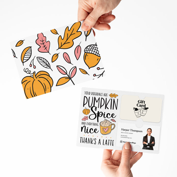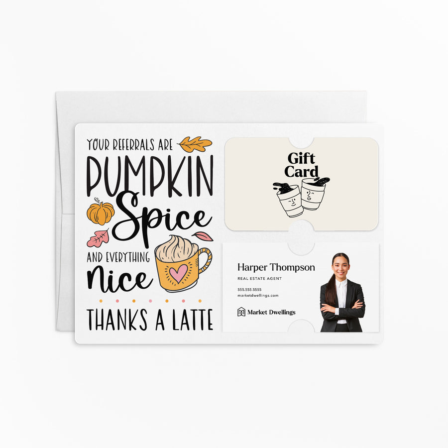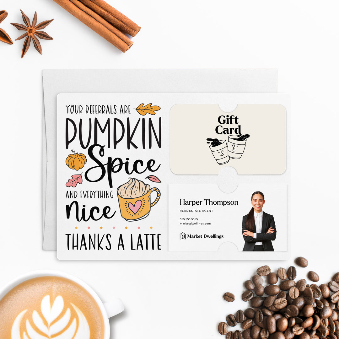 SET of Pumpkin Spice Latte Referral Gift Card & Business Card Holder Mailers w/Envelopes | Client Thank You | Fall Coffee Mailer | Pop By Gift | M36-M008