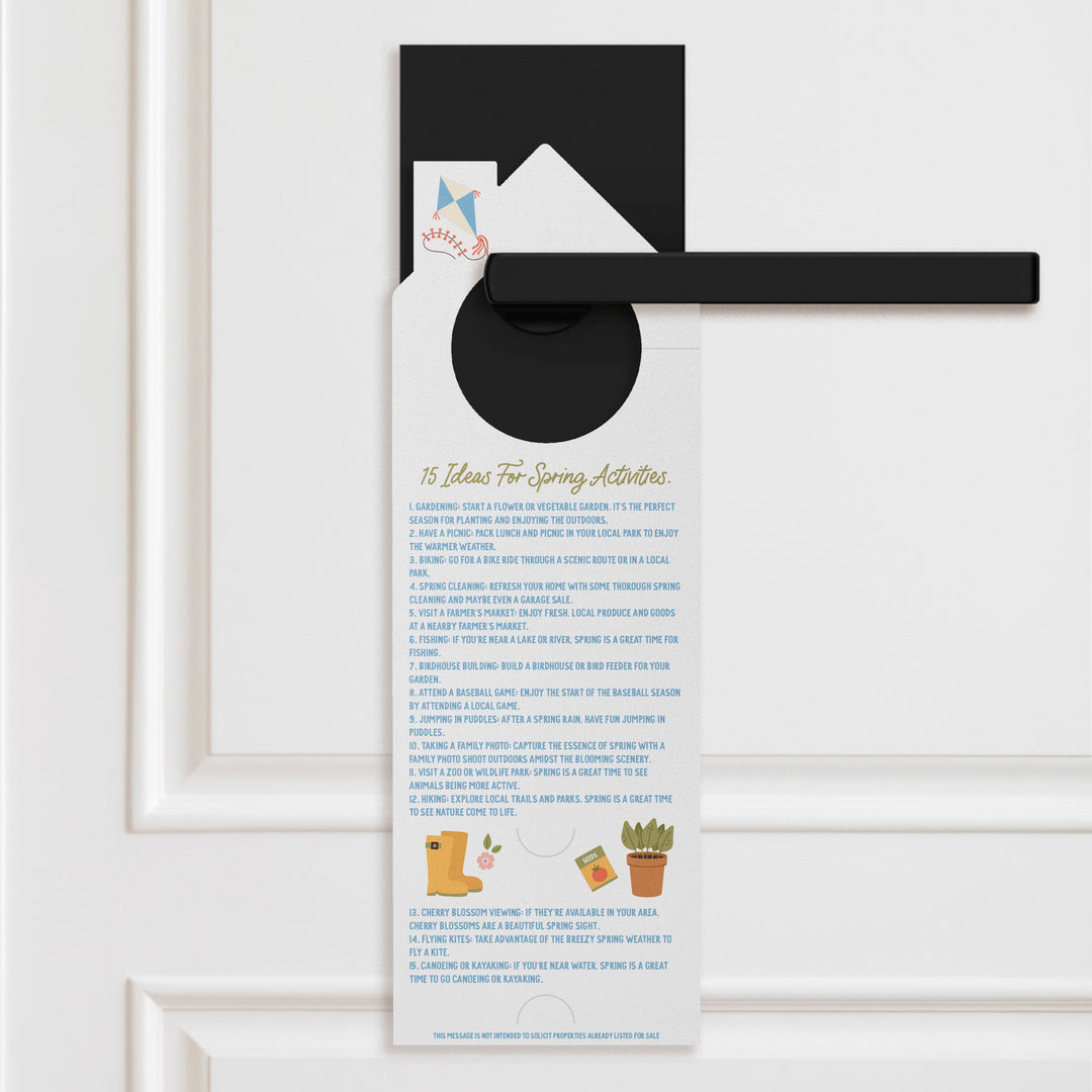 Real estate agents will love the Spring Activities | Spring Door Hangers. They offer a creative and eye-catching way to stay top of mind with clients during the busy spring season. By thanking clients with this product, agents can build trust and strengthen relationships, leading to increased referrals and business growth. The use of keywords such as "referral appreciation cards" and "spring door hangers" will also help increase search visibility, making it easier for potential clients to find and connect with agents.