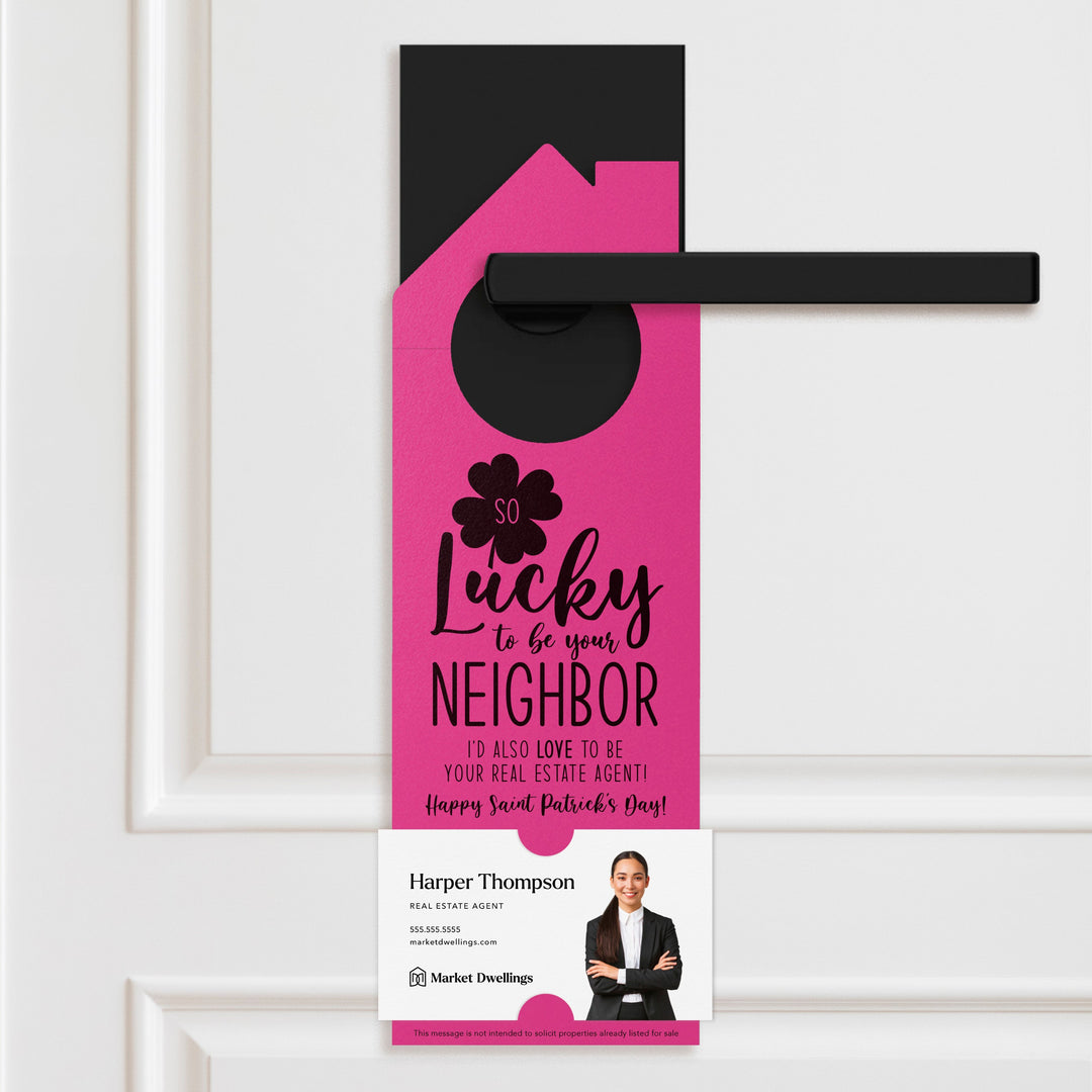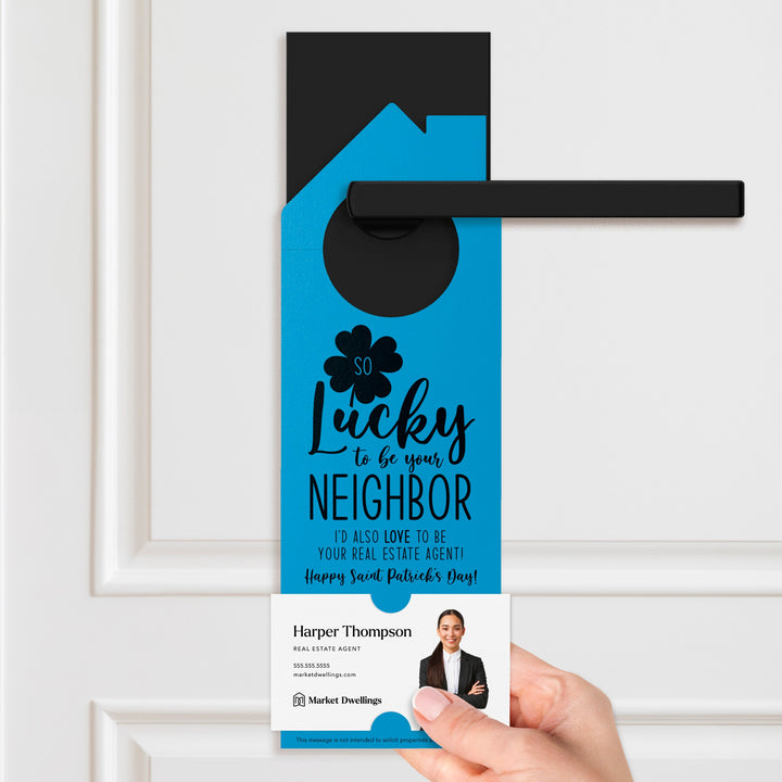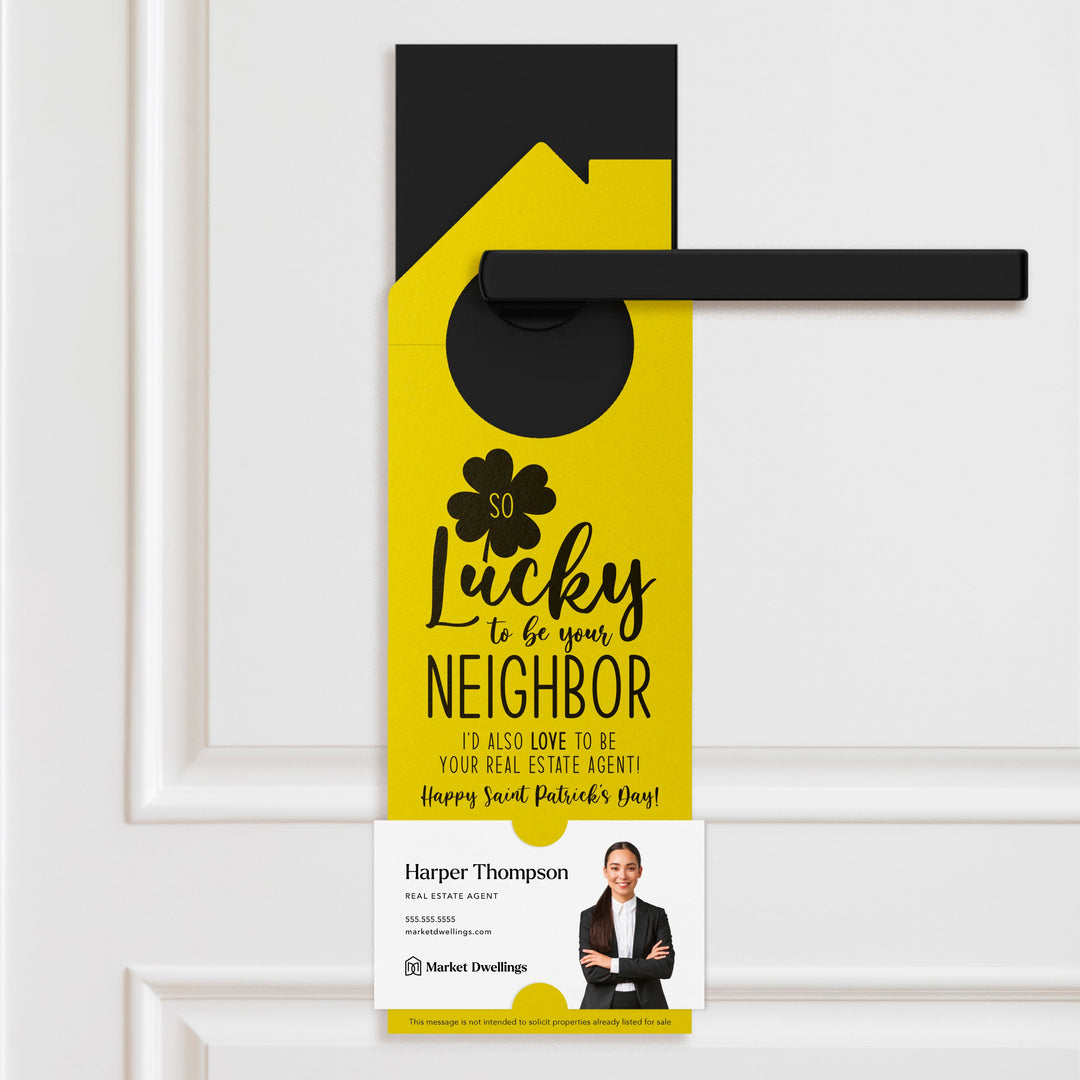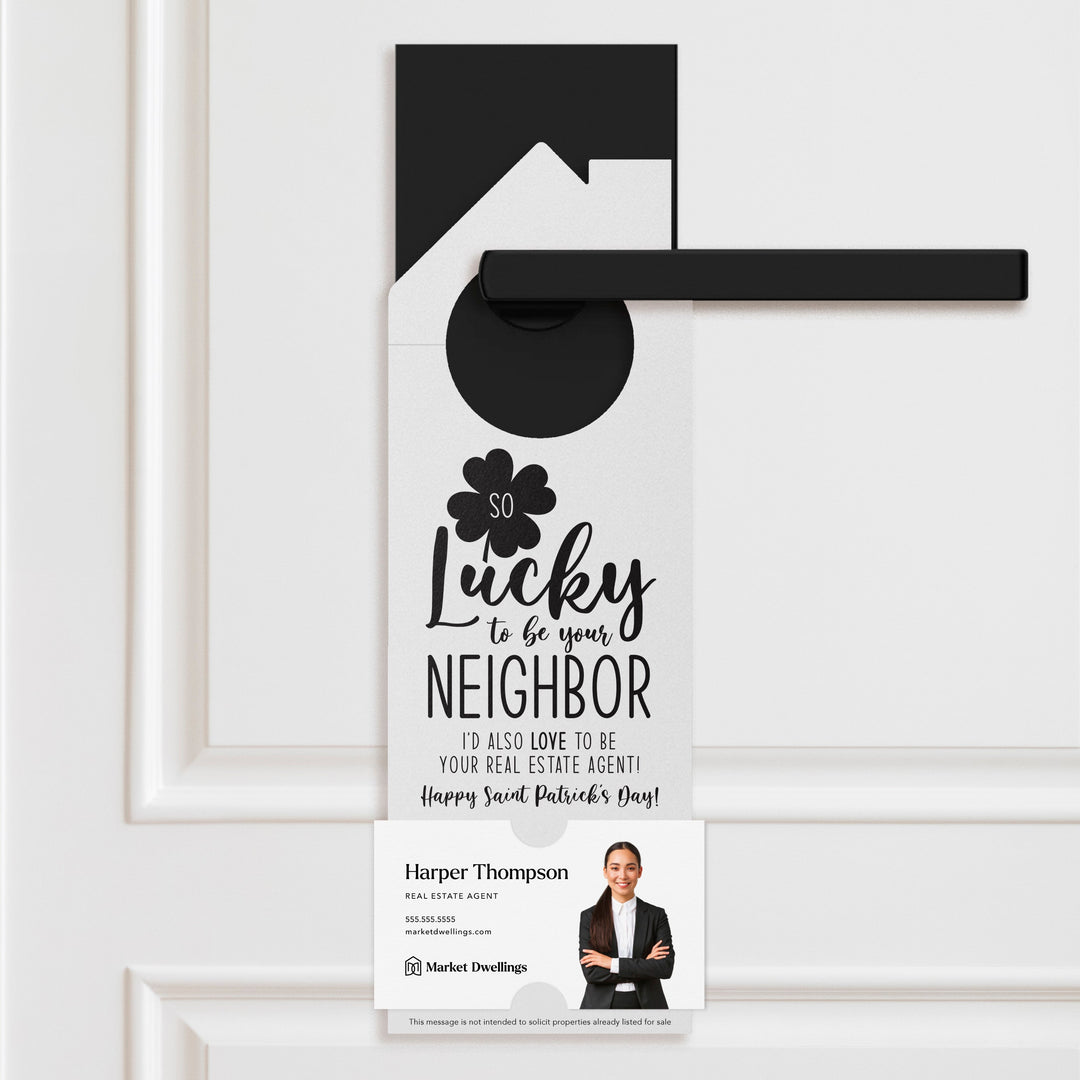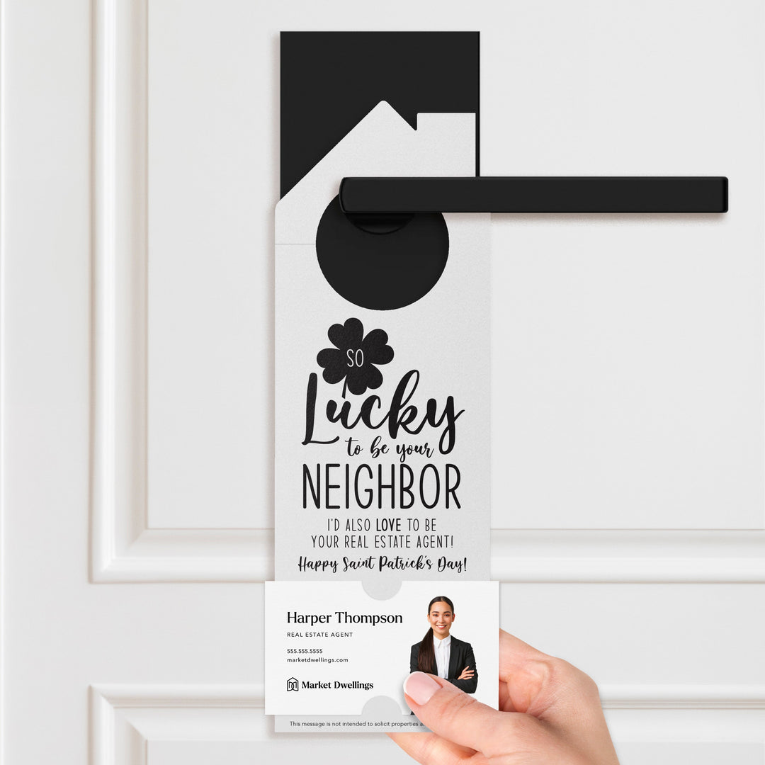 Welcome to the most effective and thoughtful marketing tool for real estate agents - the So Lucky to Be Your Neighbor Door Hangers! As a real estate professional, you know that building and nurturing client relationships is key to growing your business. Our door hangers provide a warm and personal touch, making your clients feel valued and appreciated. With a slot to hold your business card, these door hangers are not just a marketing tool but also a way to strengthen your connections with potential and current clients. Stand out in your neighborhood and show your clients how lucky they are to have you as their neighbor with our SP1-DH002 door hangers. Order now and elevate your real estate business to new heights!