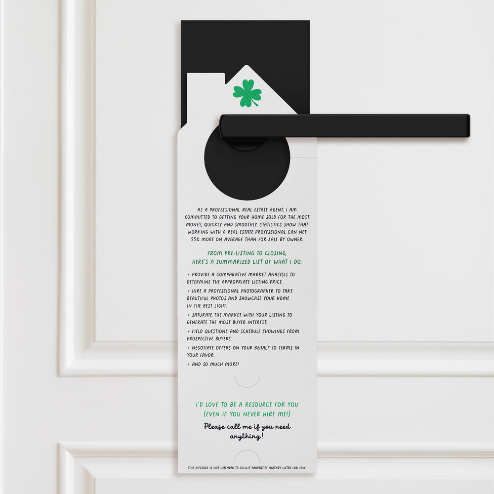 Attention all real estate agents! Are you tired of struggling to stand out in the competitive market and maintain strong client relationships? Look no further than our St. Patrick's Day Door Hangers - the perfect solution for growing your business and nurturing your clients. With their professional and thoughtful design, these door hangers will not only catch the eye of potential buyers but also showcase your personal brand and contact information. Don't get caught in a pinch trying to sell your own home - let our door hangers do the work for you. Order now and see the positive impact on your business!
