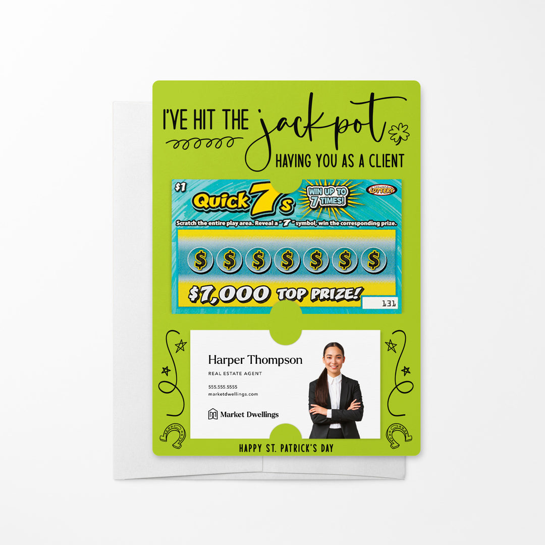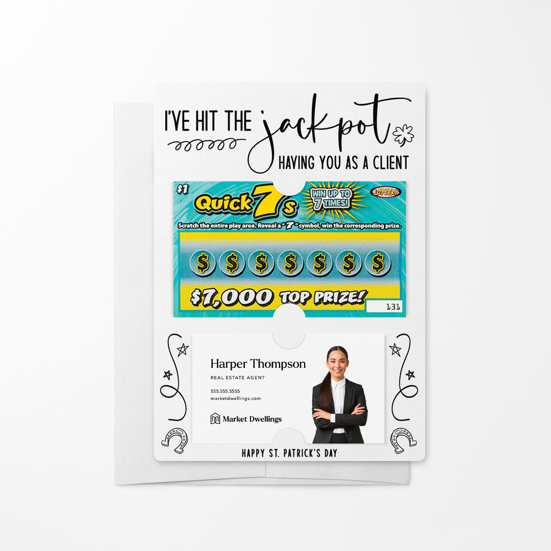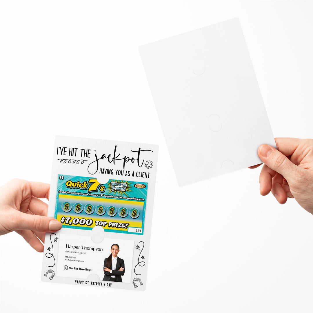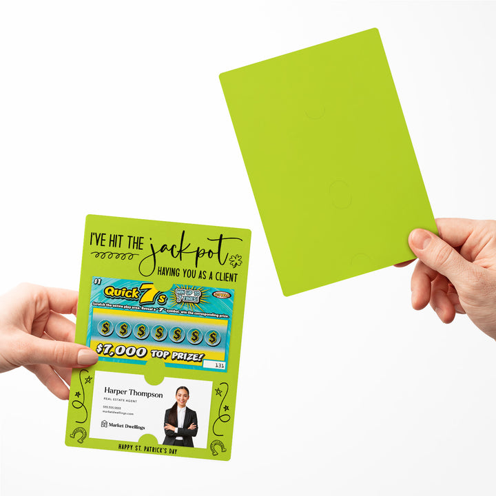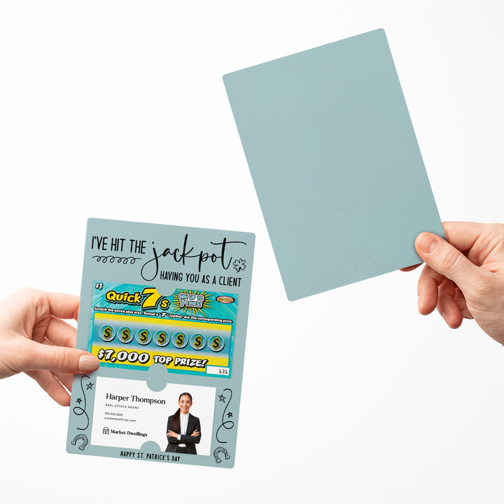 Celebrate your clients this St. Patrick's Day with our I've Hit the Jackpot Having You as a Client Mailers w/ Envelopes! These festive and engaging mailers are a creative way to express your appreciation for their business and referrals. Featuring slots for a scratch-off ticket and your business card, these mailers combine fun, luck, and professionalism. Each mailer comes complete with an easy peel-and-stick white envelope, ensuring a seamless mailing experience.