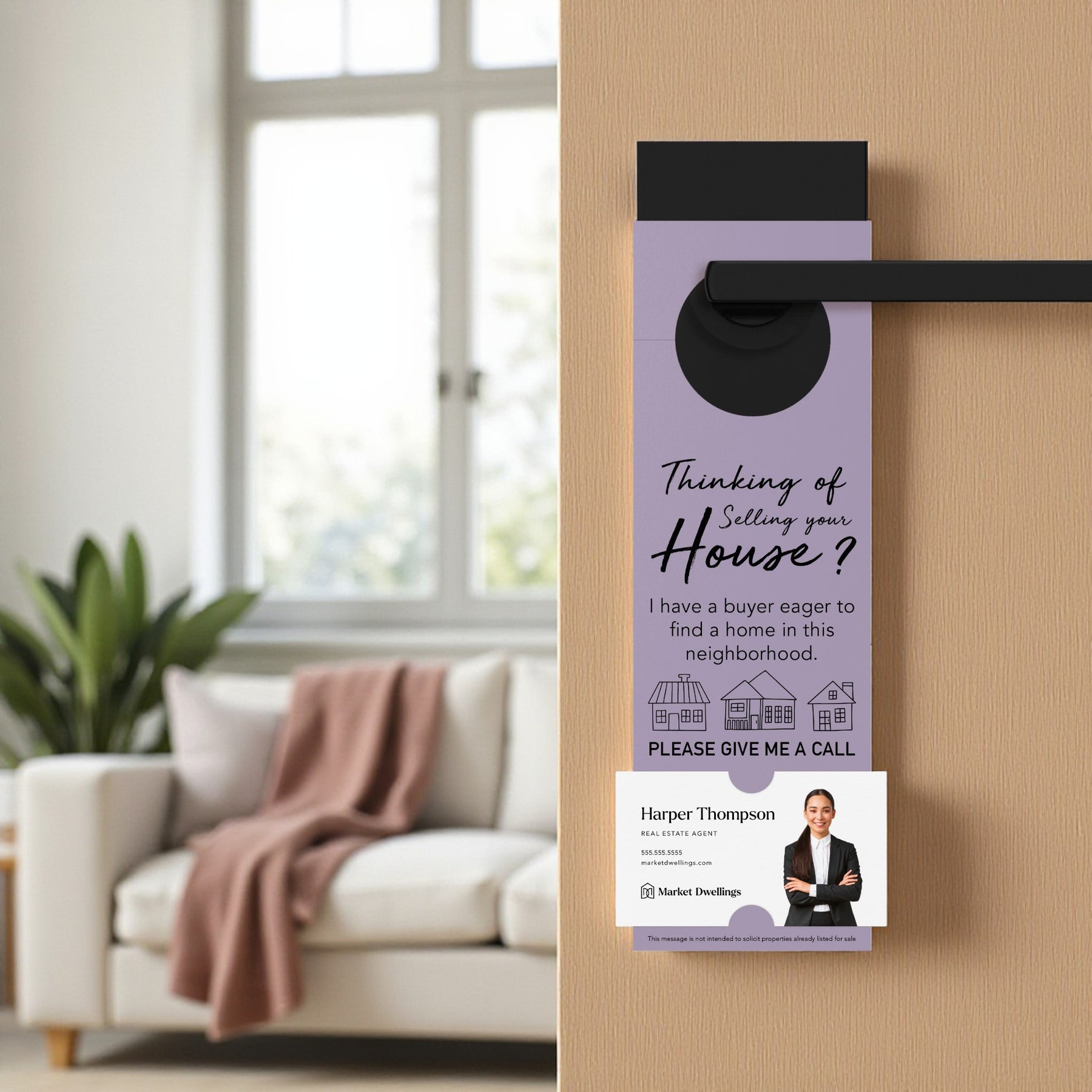 Reach homeowners considering selling their property with our "Thinking of Selling?" Real Estate Door Hanger. Designed to highlight your expertise and connect with potential sellers, this door hanger features a simple and compelling message. It includes a customizable business card slot to personalize your outreach and make a lasting impression.