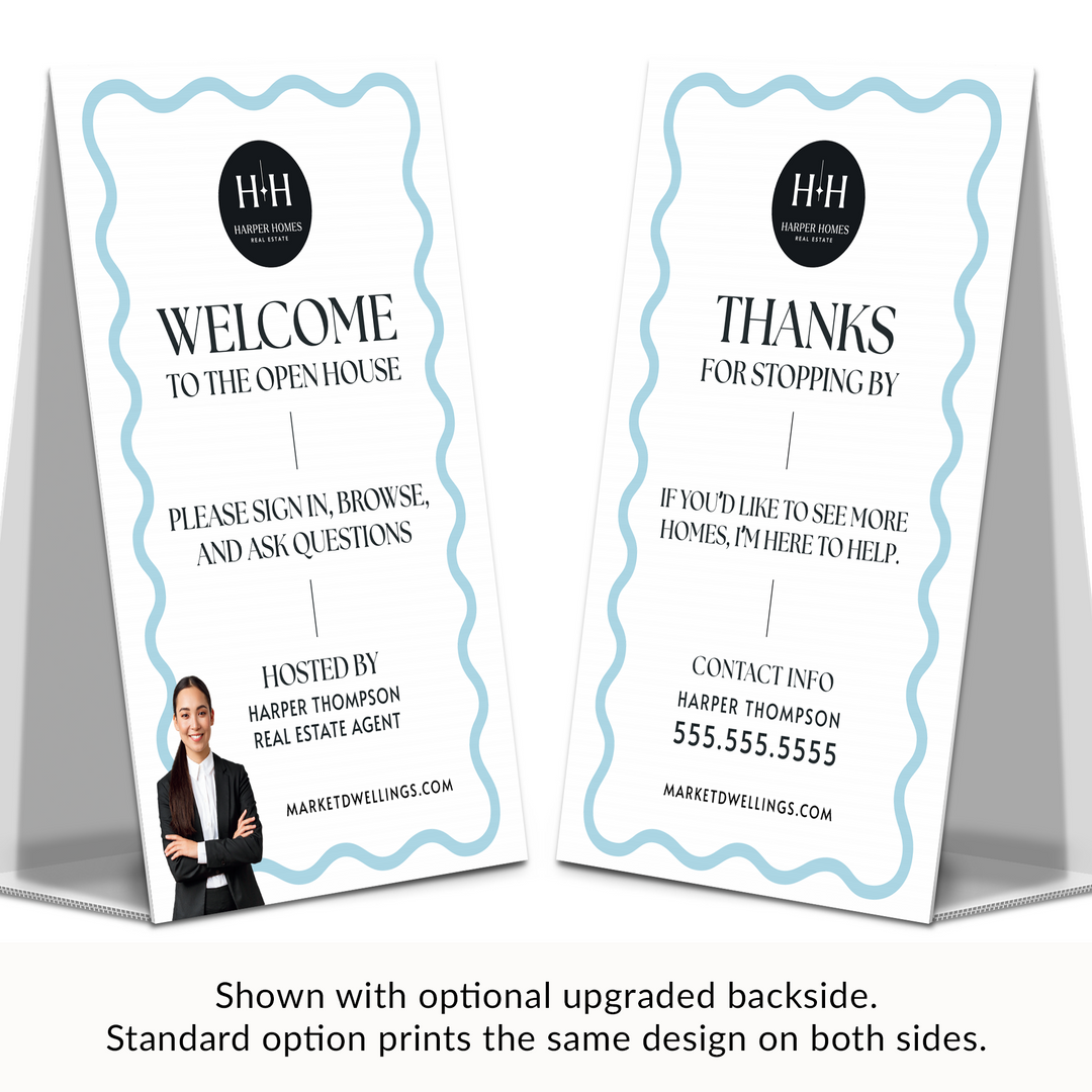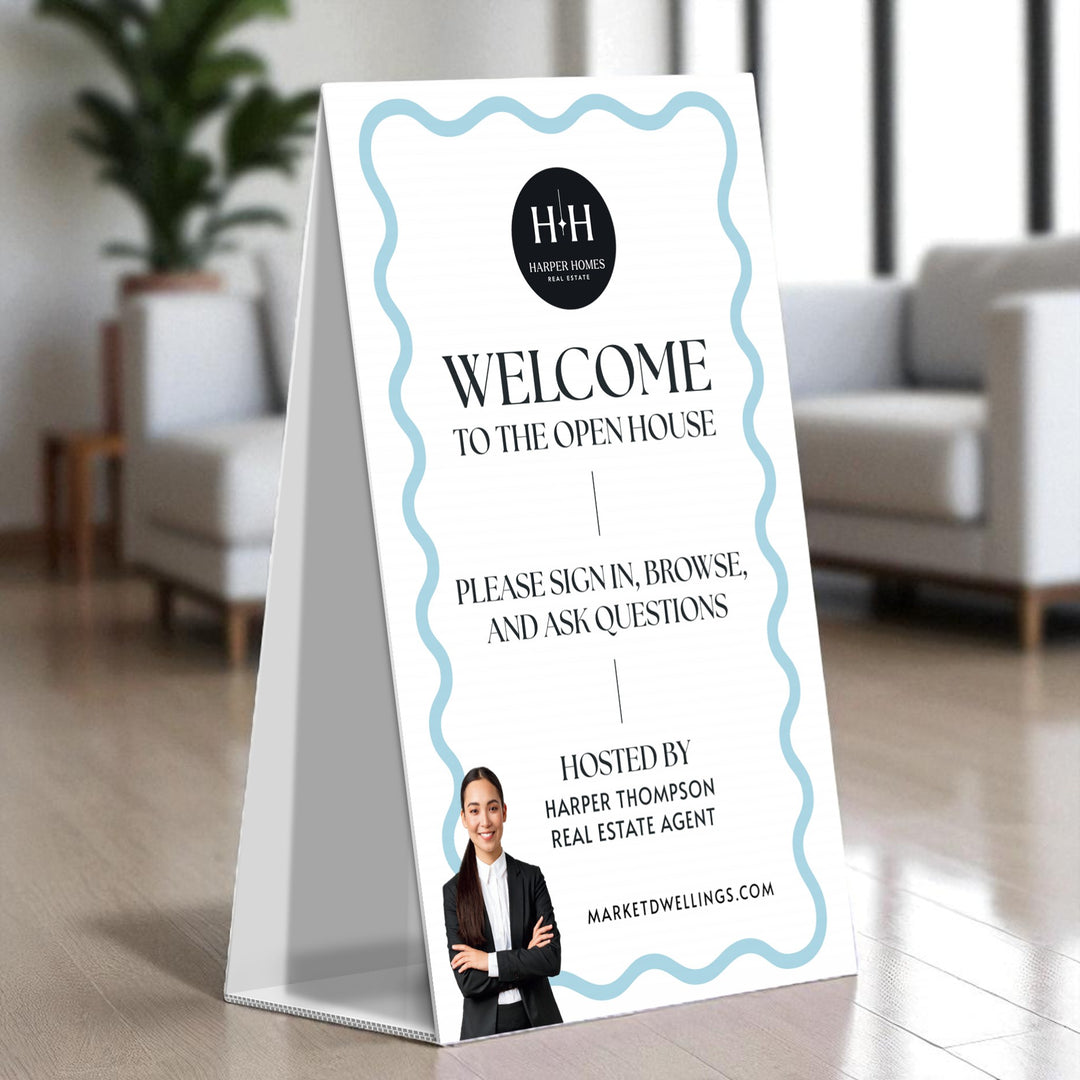 Keywords: corrugated a-frame sign, real estate open house sign, portable real estate signage, double-sided a-frame, corrugated plastic a-frame, custom real estate sign