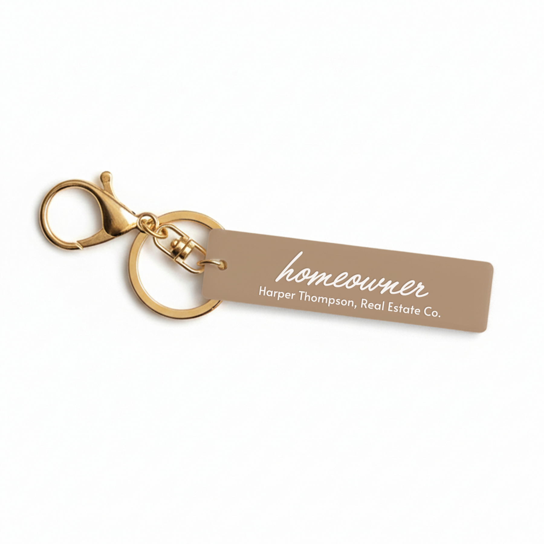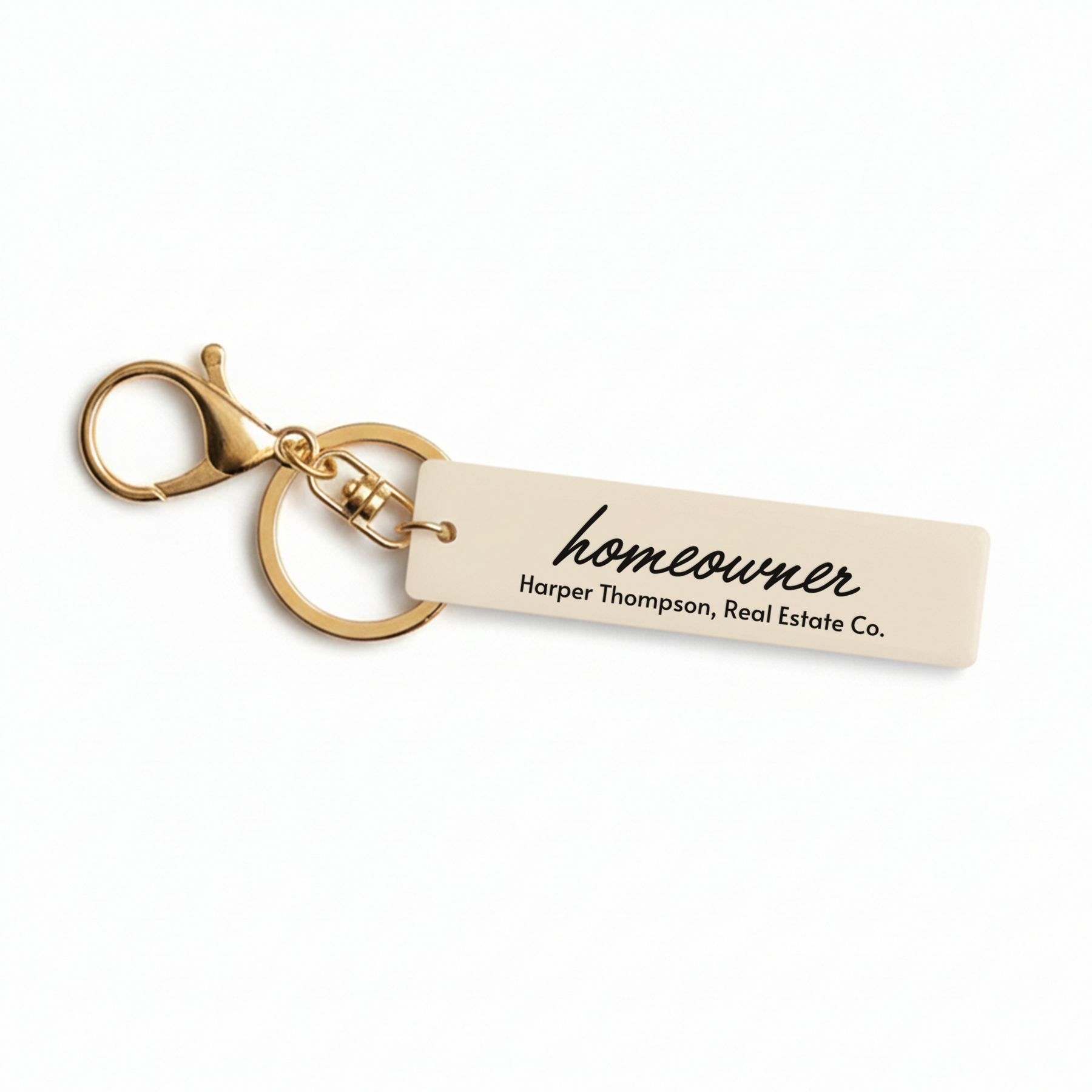 Sleek, simple, and branded — this slim bar keychain features an elegant "Homeowner" design with your name and brokerage engraved right below. Laser engraved and paint-filled on premium acrylic, it's the kind of closing gift clients will clip on and never take off.