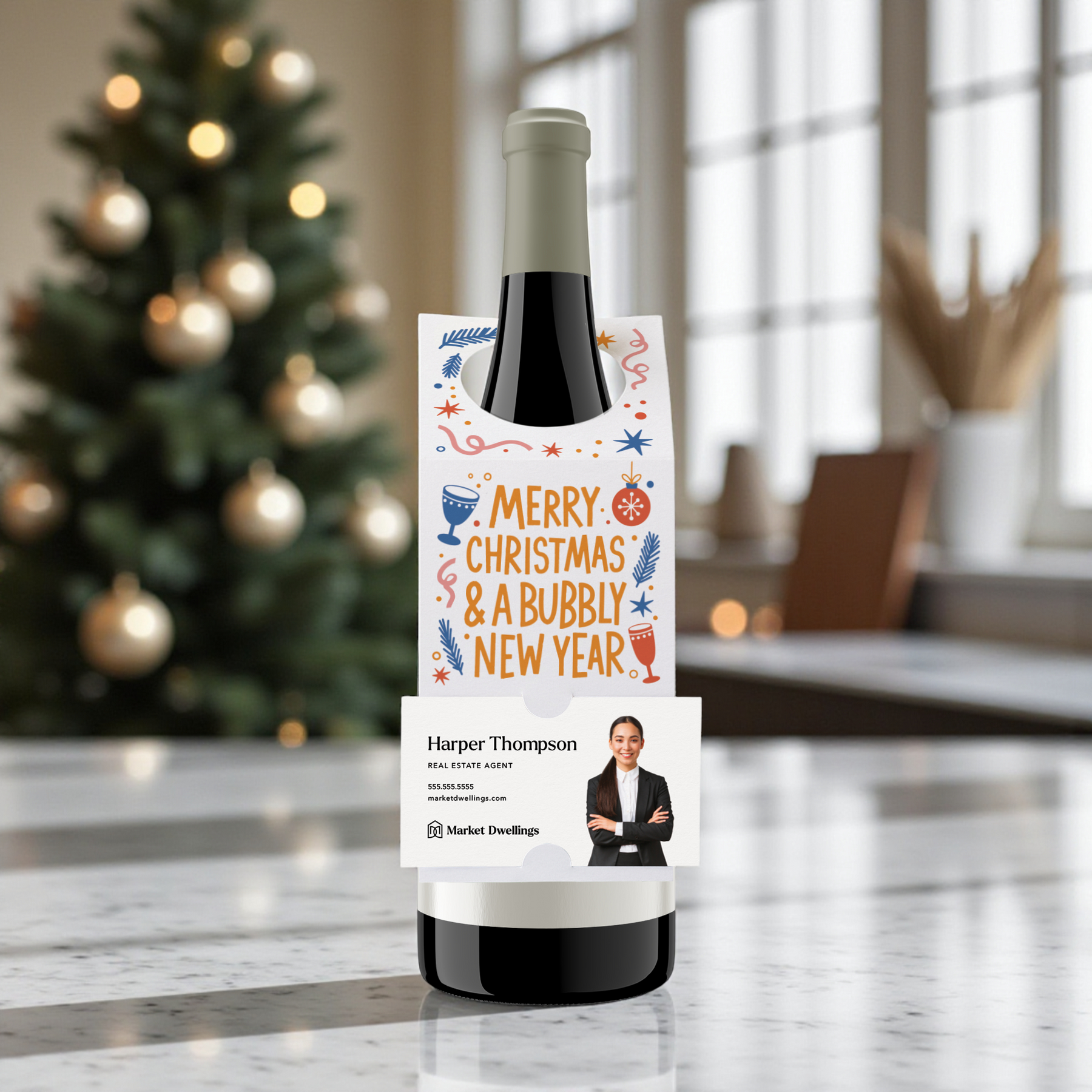 Christmas and New Year bottle tags, customizable bottle hang tags, festive wine tags, client appreciation tags, professional real estate tags, personalized bottle tags, branded holiday tags, real estate marketing tools, realtor promotional materials, seasonal gift tags, holiday branding tools, thoughtful client gifts, business card bottle tags, celebratory marketing tools, client engagement tools, real estate branding materials.