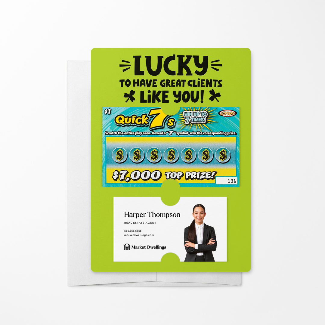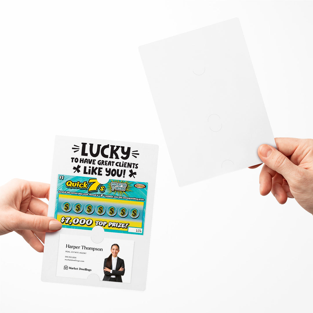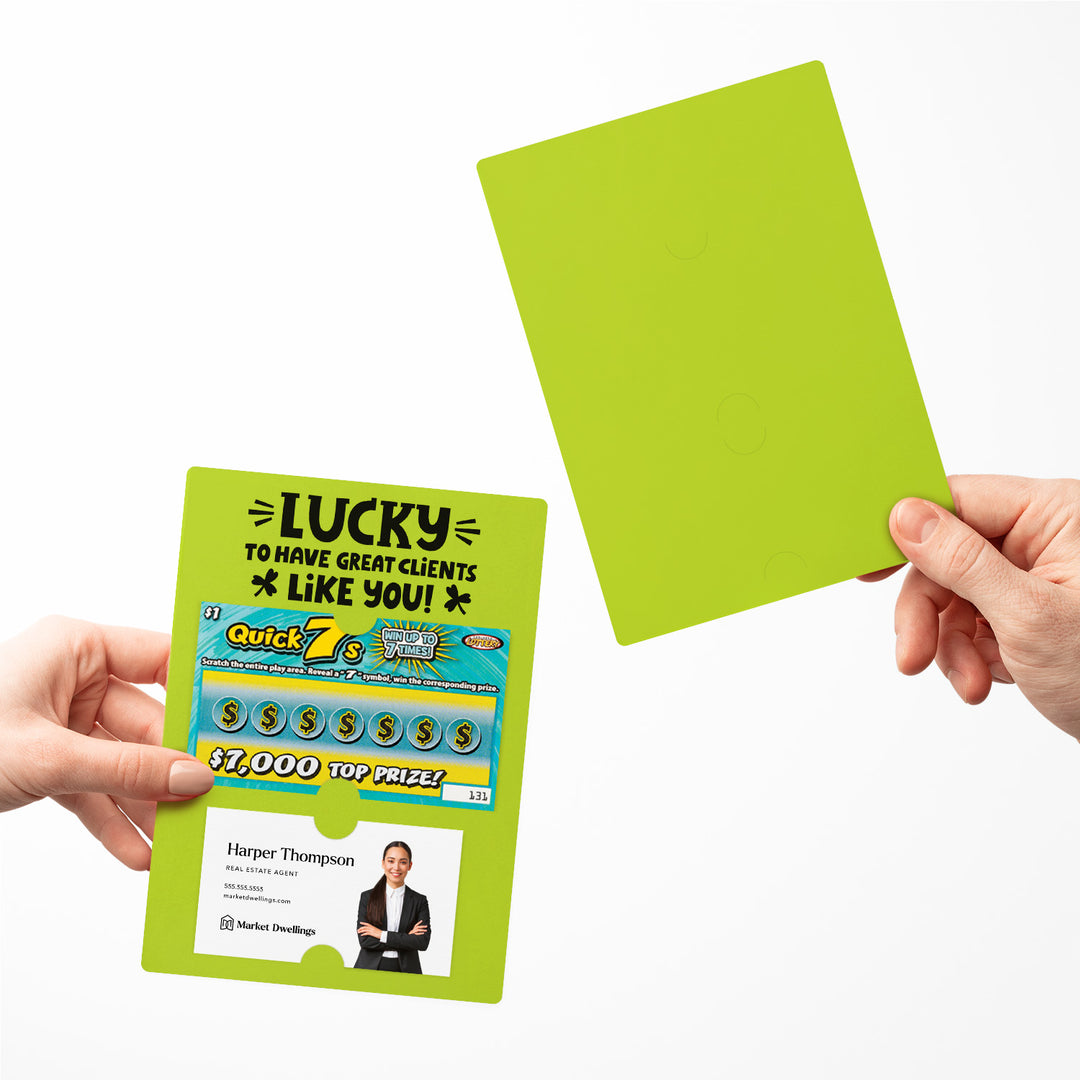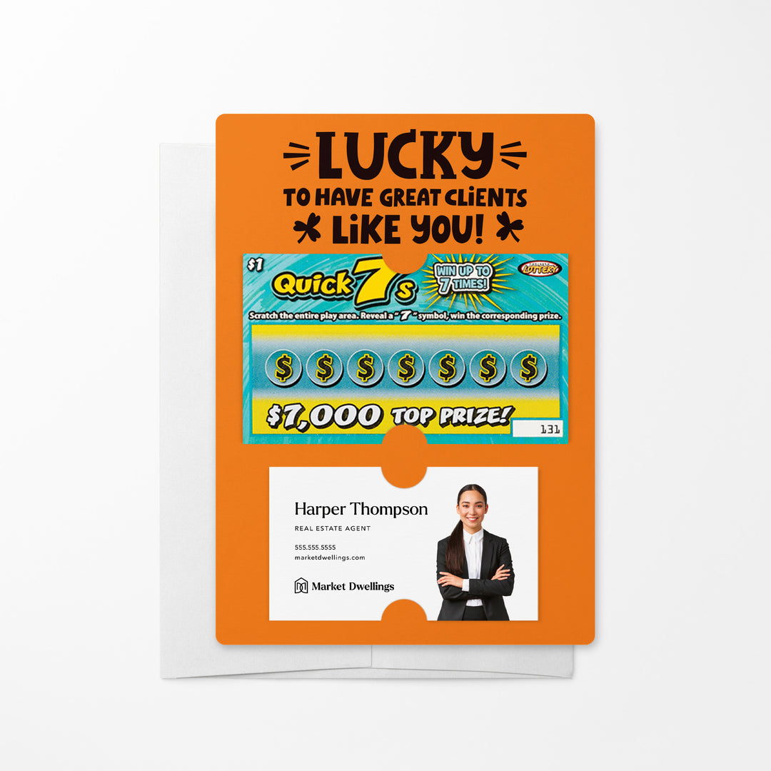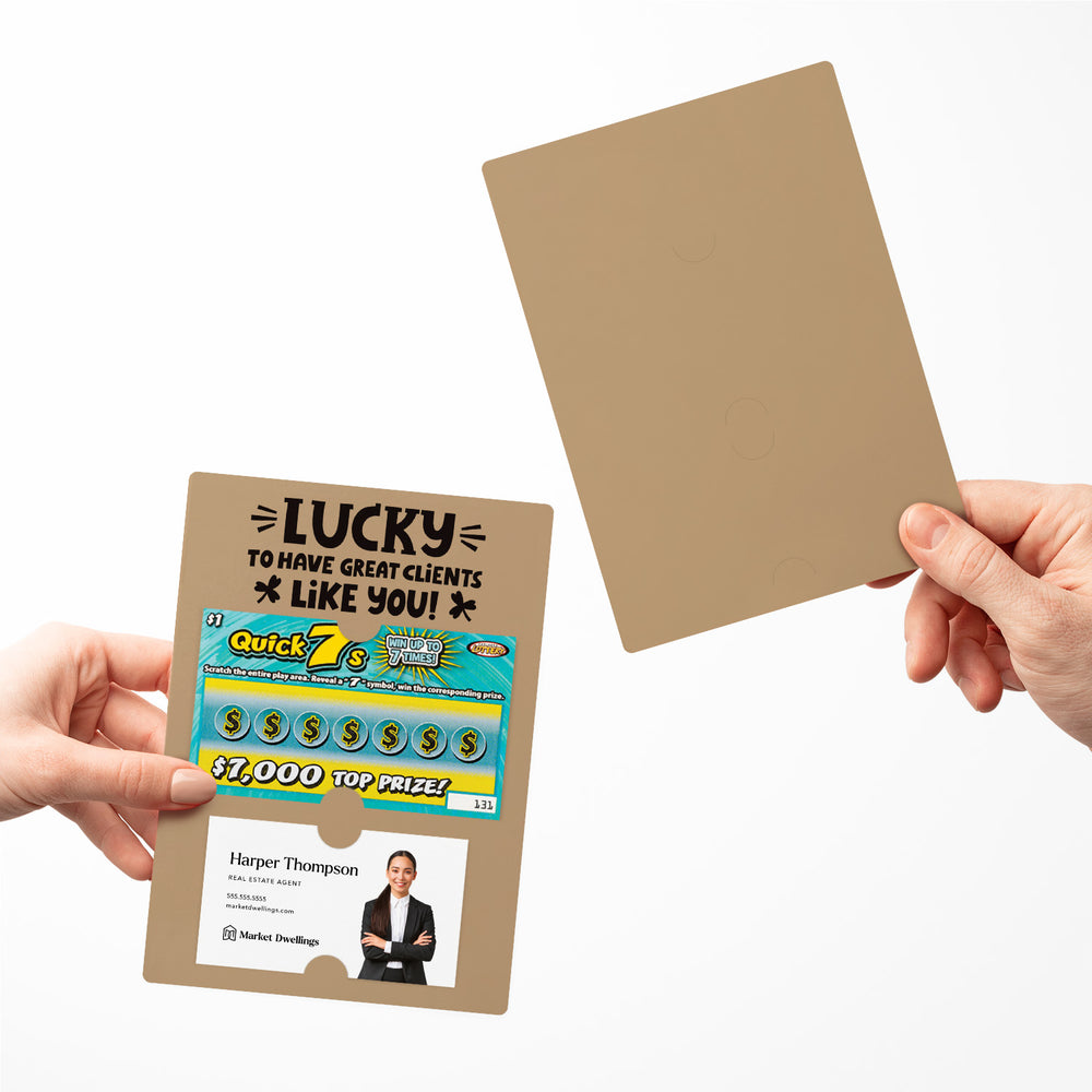 Show your appreciation this season with our Lucky to Have Great Clients Like You Mailers w/ Envelopes! These thoughtful mailers are a wonderful way to express gratitude for your clients and their referrals. Featuring slots for a scratch-off ticket and your business card, these mailers blend the charm of good fortune with professional branding. Each mailer includes an easy peel-and-stick white envelope for hassle-free mailing.