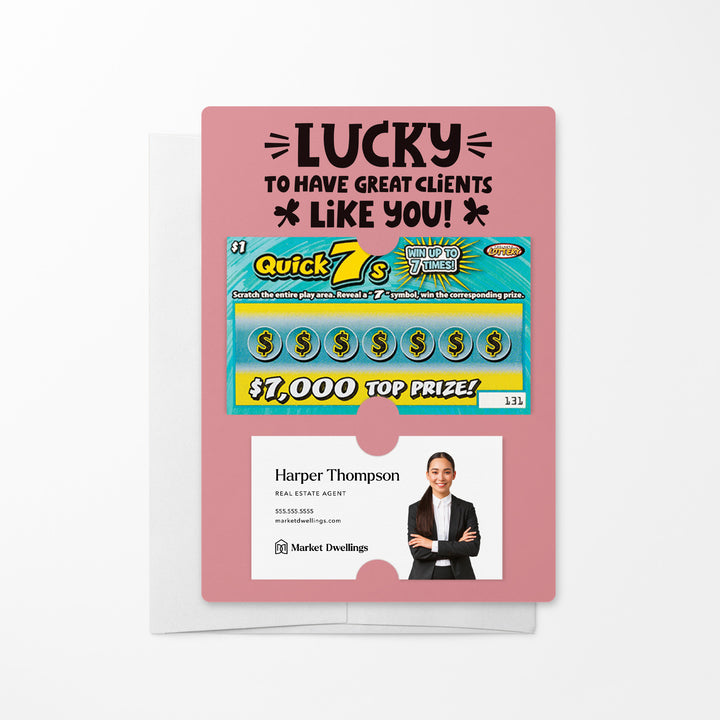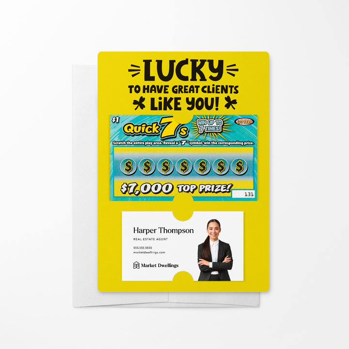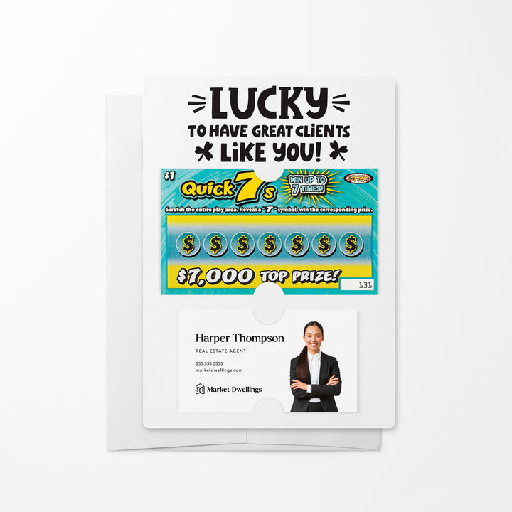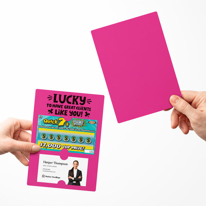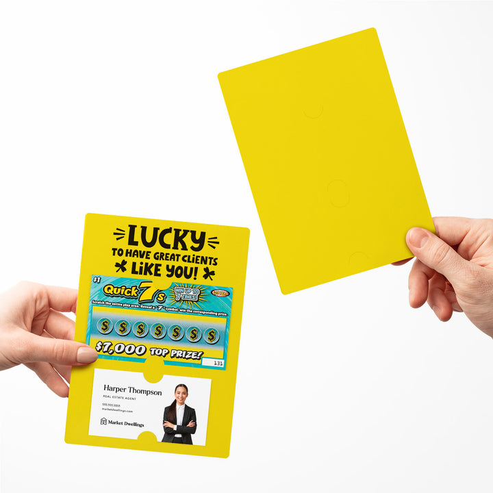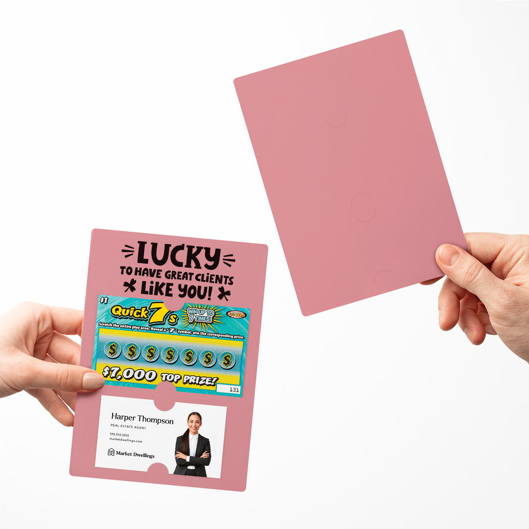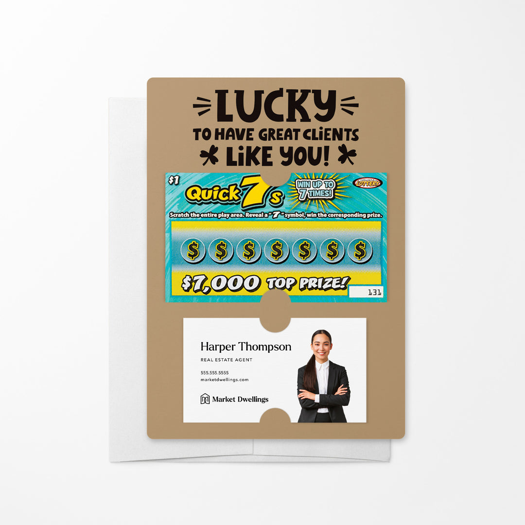 Show your appreciation this season with our Lucky to Have Great Clients Like You Mailers w/ Envelopes! These thoughtful mailers are a wonderful way to express gratitude for your clients and their referrals. Featuring slots for a scratch-off ticket and your business card, these mailers blend the charm of good fortune with professional branding. Each mailer includes an easy peel-and-stick white envelope for hassle-free mailing.