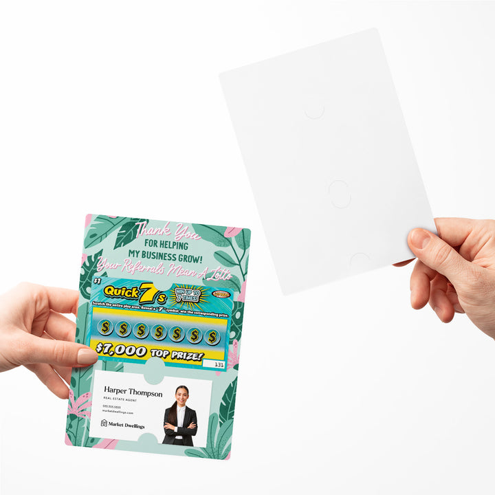 Express your gratitude with our Thank You For Helping My Business Grow! Your Referrals Mean A Lotto Mailers w/ Envelopes! These thoughtful and creative mailers are a perfect way to show your clients how much you value their trust and referrals. Featuring slots for a scratch-off ticket and your business card, these mailers combine heartfelt thanks with professional branding. Each mailer includes an easy peel-and-stick white envelope for hassle-free mailing.