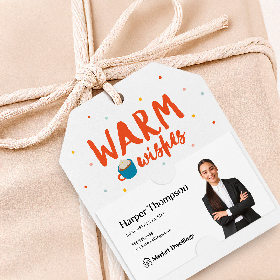 Looking for a thoughtful and professional way to show your clients that you appreciate them this holiday season? Our Warm Wishes Gift Tags are the perfect solution for real estate agents looking to grow their business and nurture client relationships. These festive gift tags feature a charming holiday design and a handy slot to hold your business card, making it easy to add a personal touch to your gifts. Spread holiday cheer and leave a lasting impression with our Happy Holidays Pop By Gift Tags. Order now and make your clients feel special during this season of giving.